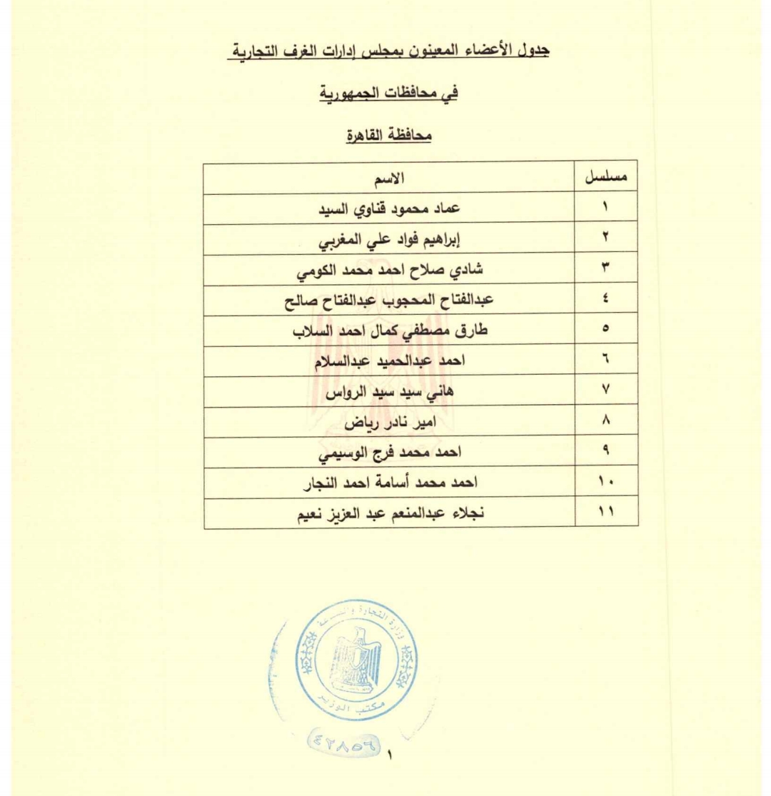 وشمل القرار تعيين 11 عضوا وهم أحمد عبد الحميد عبدالسلام، وعماد محمود قناوي السيد، وابراهيم فؤاد على المغربي، وشادي صلاح أحمد الكومي، وعبد الفتاح المحجوب صالح، وطارق مصطفى كمال السلاب، وهاني السيد الرواس، وأمير نادر رياض، وأحمد محمد الوسيمي، وأحمد محمد النجار، ونجلاء عبد المنعم نعيم.