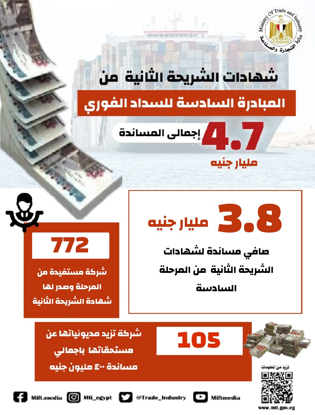 أعلن المهندس أحمد سمير وزير التجارة والصناعة أن صندوق تنمية الصادرات أصدر شهادات الشريحة الثانية من المرحلة السادسة من مبادرة السداد الفوري بإجمالي مساندة 4.7 مليار جنيه وبصافي مساندة 3.8 مليار جنيه وذلك في إطار تنفيذ المبادرة بالتعاون والتنسيق بين وزارة التجارة والصناعة ووزارة المالية.