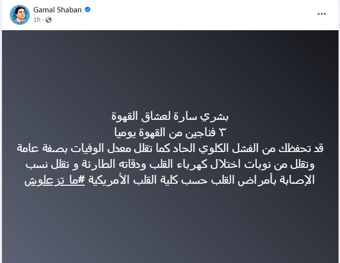 وعن فوائد تناول القهوة قال الدكتور جمال شعبان "بشرى سارة لعشاق القهوة.. ٣ فناجين من القهوة يوميا قد تحفظك من الفشل الكلوي الحاد كما تقلل معدل الوفيات بصفة عامة وتقلل من نوبات اختلال كهرباء القلب ودقاته الطارئة وتقلل نسب الإصابة بأمراض القلب حسب كلية القلب الأمريكية"