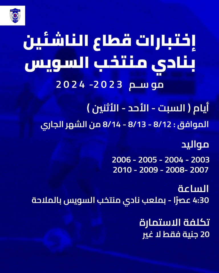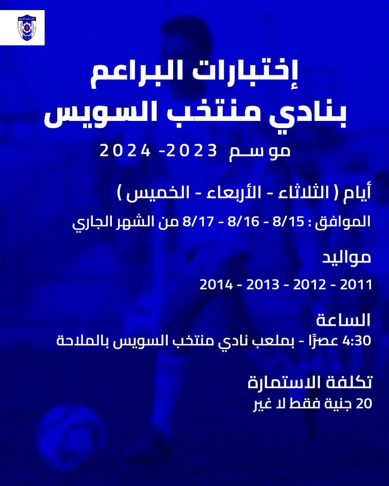 اختبارات الناشئين، أعلن نادي منتخب السويس عن بدء اختبارات قطاع الناشئين والبراعم موسم 2024/2023.