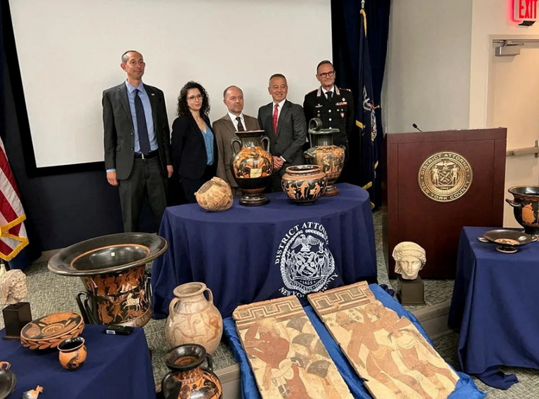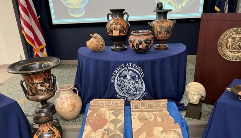 وأظهرت صور من وزارة الثقافة الإيطالية القطع الأثرية التي تشمل أوان ورأس تمثال وبعض العملات المعدنية خلال عرضها في حفل أقيم قبل أيام في نيويورك بمناسبة استردادها.