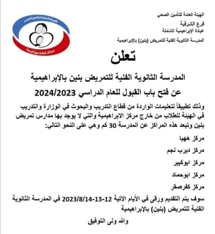 وقال انه تم إعادة فتح باب القبول لمدرسة التمريض بنين بالإبراهيمية وذلك للعام الدراسي ٢٠٢٤/٢٠٢٣ وذلك تطبيقًا للتعليمات الواردة من قطاع التدريب والبحوث فى الوزارة والتدريب فى الهيئة للطلاب من خارج مركز الإبراهيمية والتي لا يوجد بها مدارس تمريض بنين وتبعد هذه المراكز عن المدرسة ٣٠كم وهي مركز ههيا ومركز ديرب نجم ومركز أبو كبير ومركز أبو حماد ومركز كفر صقر سوف يتم التقديم ورقي في الأيام الآتية ١٤،١٣،١٢ من أغسطس بالمدرسه بحد أدنى مجموع ٢٥٠.