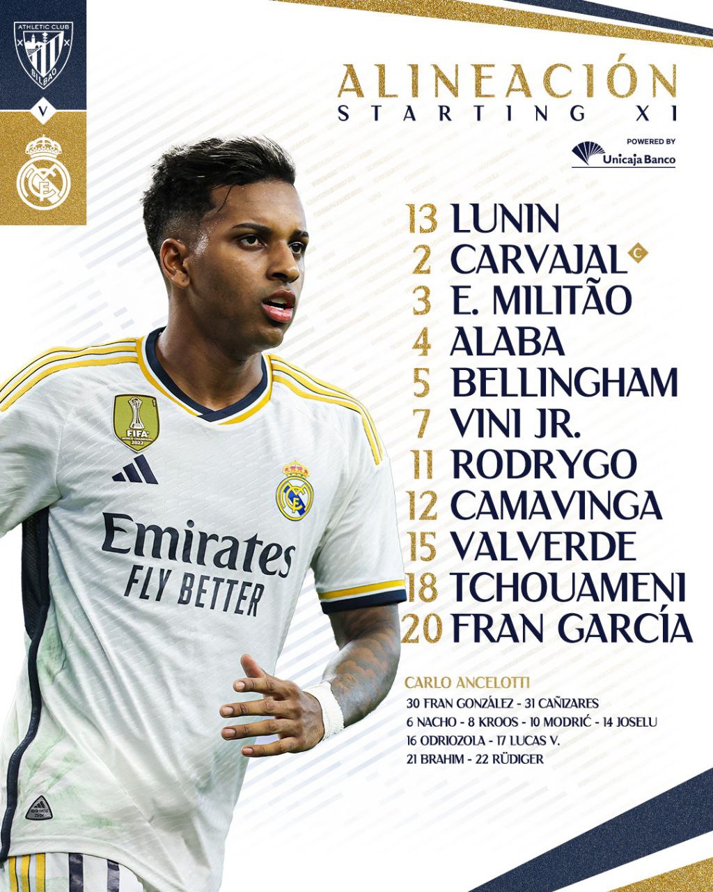 الدوري الإسباني، أعلن كارلو أنشيلوتي المدير الفني الإيطالي لنادي ريال مدريد تشكيل فريقه استعدادًا لمواجهة أتليتك بلباو في الجولة الأولى لليجا الإسبانية، في المباراة التي ستنطلق في العاشرة والنصف مساء اليوم علي أرضية ملعب سان ماميس معقل فريق اتيليتك بلباو.