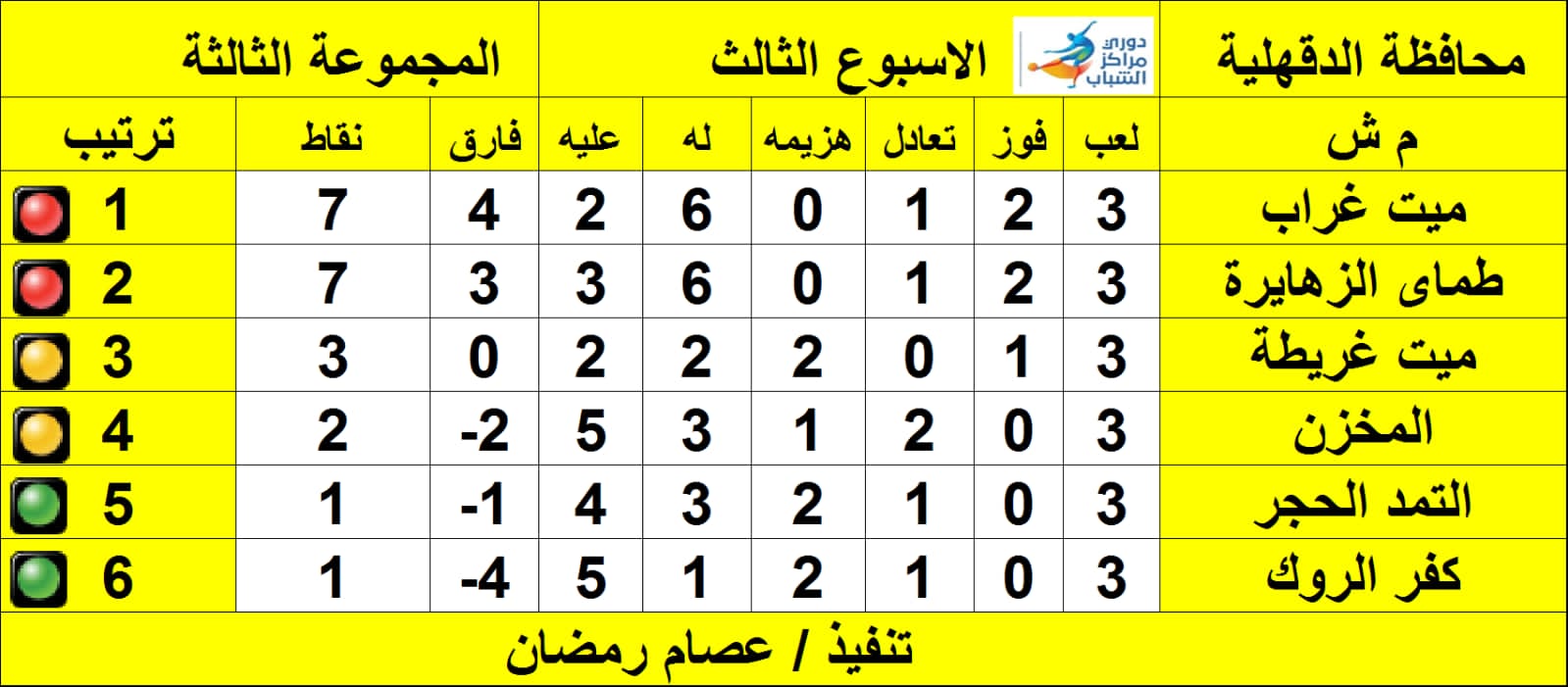 المجموعة الثالثة تصدر ترتيب الدوري بها مركز شباب ميت غراب بإدارة شباب السنبلاوين برصيد 7 نقاط والمركز الأول، وتراجع مركز شباب طماي الزهايرة إلى المركز الثاني برصيد 7 نقاط، بفارق الأهداف الذى كان متصدرًا فى الأسبوع الثاني بالمجموعة الثالثة.