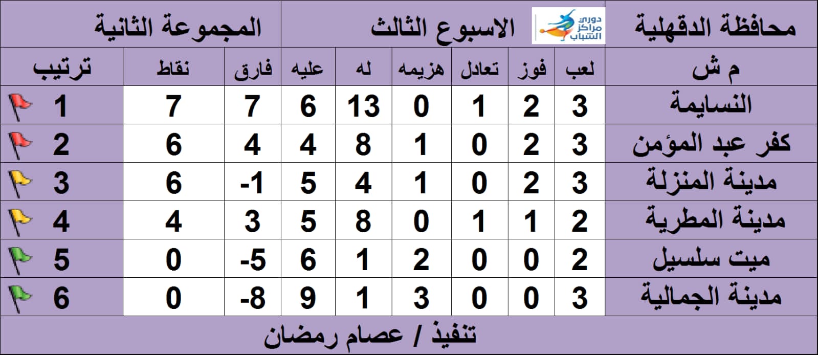 أما المجموعة الثانية مازال متصدر ترتيب الدورى مركز شباب النسايمة بإدارة شباب المنزلة برصيد 7 نقاط، والمركز الأول ضمن المجموعة الثانية، ويأتي فريق مركز شباب كفر عبد المؤمن فى المركز الثانى برصيد 6نقاط.