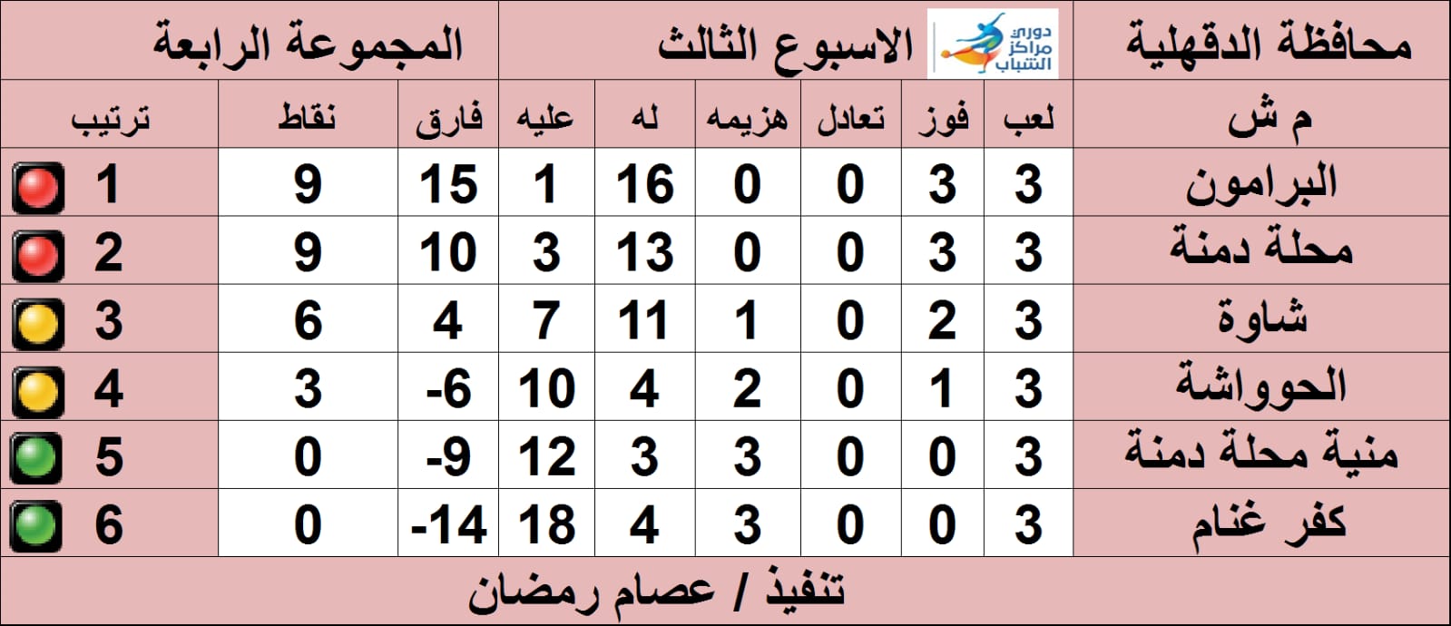 أما المجموعة الرابعة والأخيرة مازال يتصدر ترتيب الدوري بها مركز شباب البرامون برصيد 9 نقاط واحتل المركز الاول بهذه المجموعة، يليه مركز شباب محلة الدمنة فى المركز الثانى، برصيد 9 نقاط بفارق الأهداف، فى اطار مباريات دورى مراكز الشباب بالدقهلية النسخة العاشرة 2023.