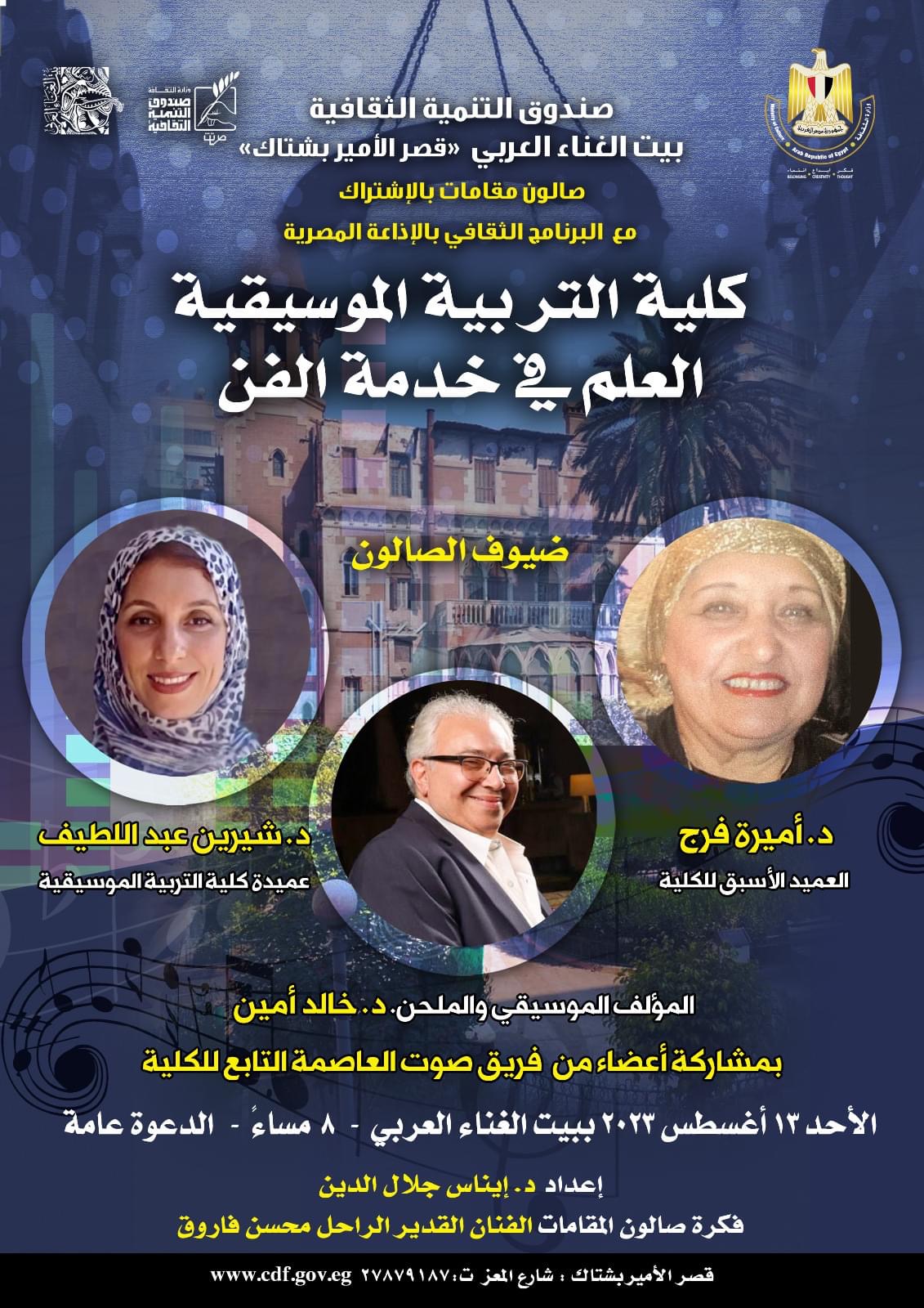 يقيم بيت الغناء العربي بقصر الأمير بشتاك، والتابع لقطاع صندوق التنمية الثقافية بالتعاون مع الإذاعة المصرية في تمام السابعة من مساء اليوم الأحد الموافق 13 أغسطس الجاري، "صالون مقامات"، حيث يعقد لقاءه الشهري الجديد تحت عنوان "كلية التربية الموسيقية.. العلم في خدمة الفن".