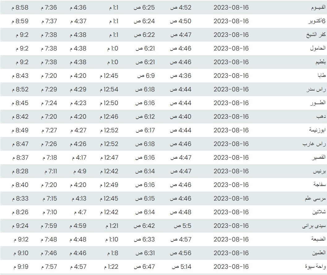 مواقيت الصلاة اليوم وفقًا للتوقيت المحلي لمدينتي القاهرة والإسكندرية وعدد من مدن ومحافظات الجمهورية من واقع بيانات الهيئة العامة للمساحة