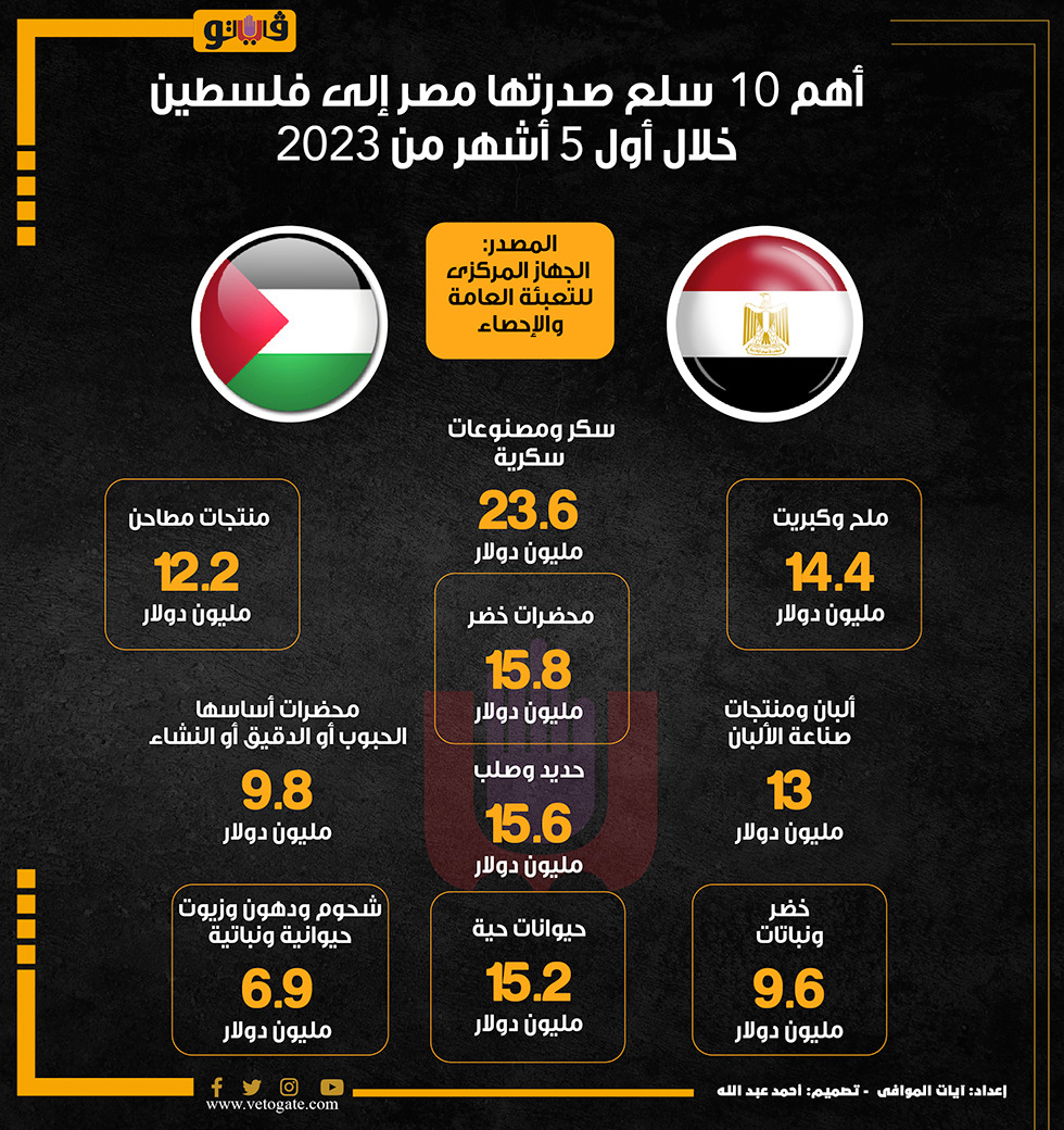 أهم 10 سلع صدرتها مصر إلى فلسطين خلال أول 5 أشهر من 2023 (انفوجراف) الأحد 13/أغسطس/2023 - 02:32 م 8/13/2023 2:32:55 PM صورة ارشيفية آيات الموافى شارك طباعة 18 حجم الخط شارك طباعة سكر خضر حية