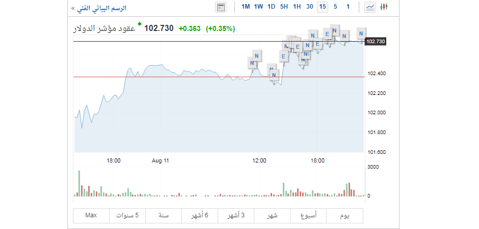 وعلى صعيد التداولات وحركة المؤشرات ارتفع مؤشر الدولار الذي يقيس أداء العملة الأمريكية موازيا 6 عملات رئيسية أخرى بنسبة 0.18% إلى 102.730 نقطة، بالقرب من أعلى مستوياته في شهر، حيث يتجه لتحقيق مكاسب جديدة.