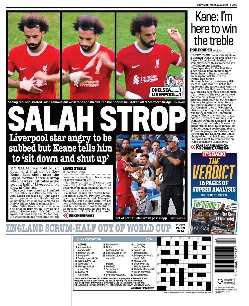 وعنونت صحيفة "ديلي ميل": "حدة صلاح.. غضب نجم ليفربول من الاستبدال ولكن كين يطالبه بأن يجلس ويخرس"، في إشارة إلى تصريحات روي كين، لاعب مانشستر يونايتد السابق.