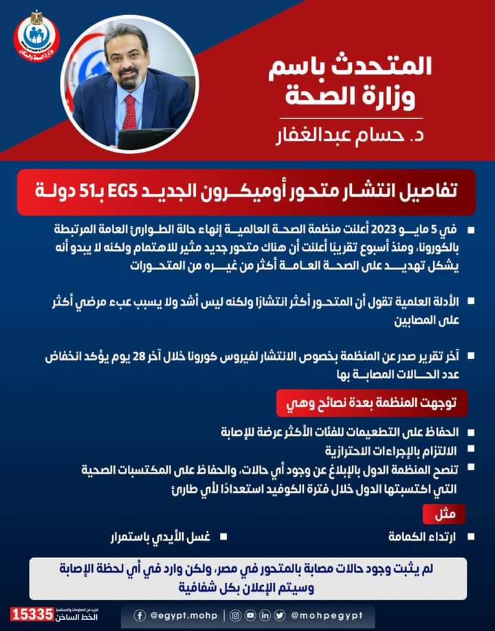 كشف الدكتور حسام عبد الغفار المتحدث باسم وزارة الصحة أن متحور أوميكرون الجديد EG5 ظهر بـ51 دولة.