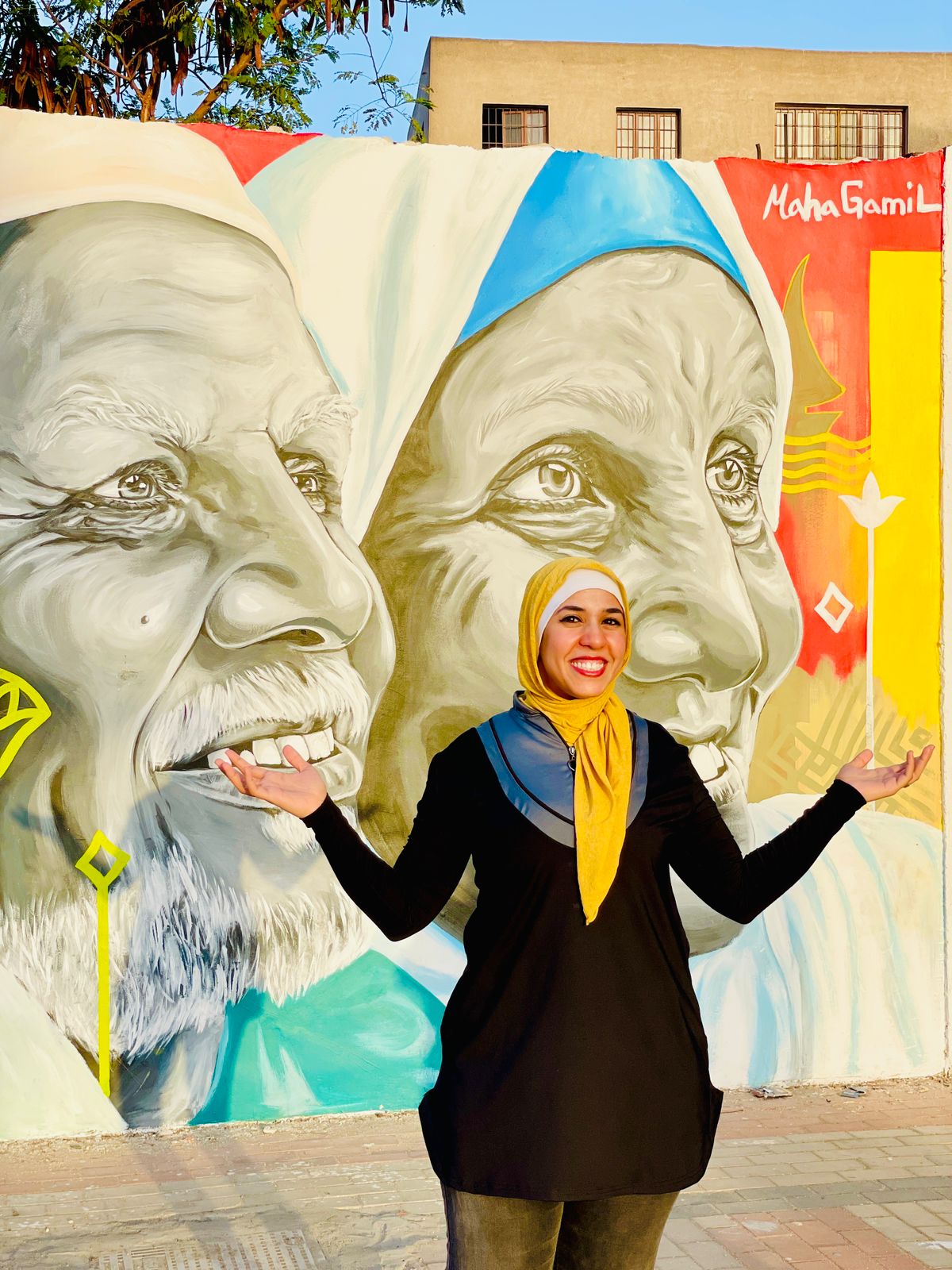 وقالت مها جميل إن الجدارية تضم وجوه 10 أشخاص، وتم اختيارها من خلال منشور على صفحتها بمواقع التواصل الاجتماعى "فيس بوك" لترشيح أشخاص بأعمار مختلفة،لرسمهم على الجدارية،يكونوا جد وجدة وأب وأم،و4 شباب وطفلين من محافظة أسوان ،مع التقاط صور فوتوغرافية لكل مرشح.