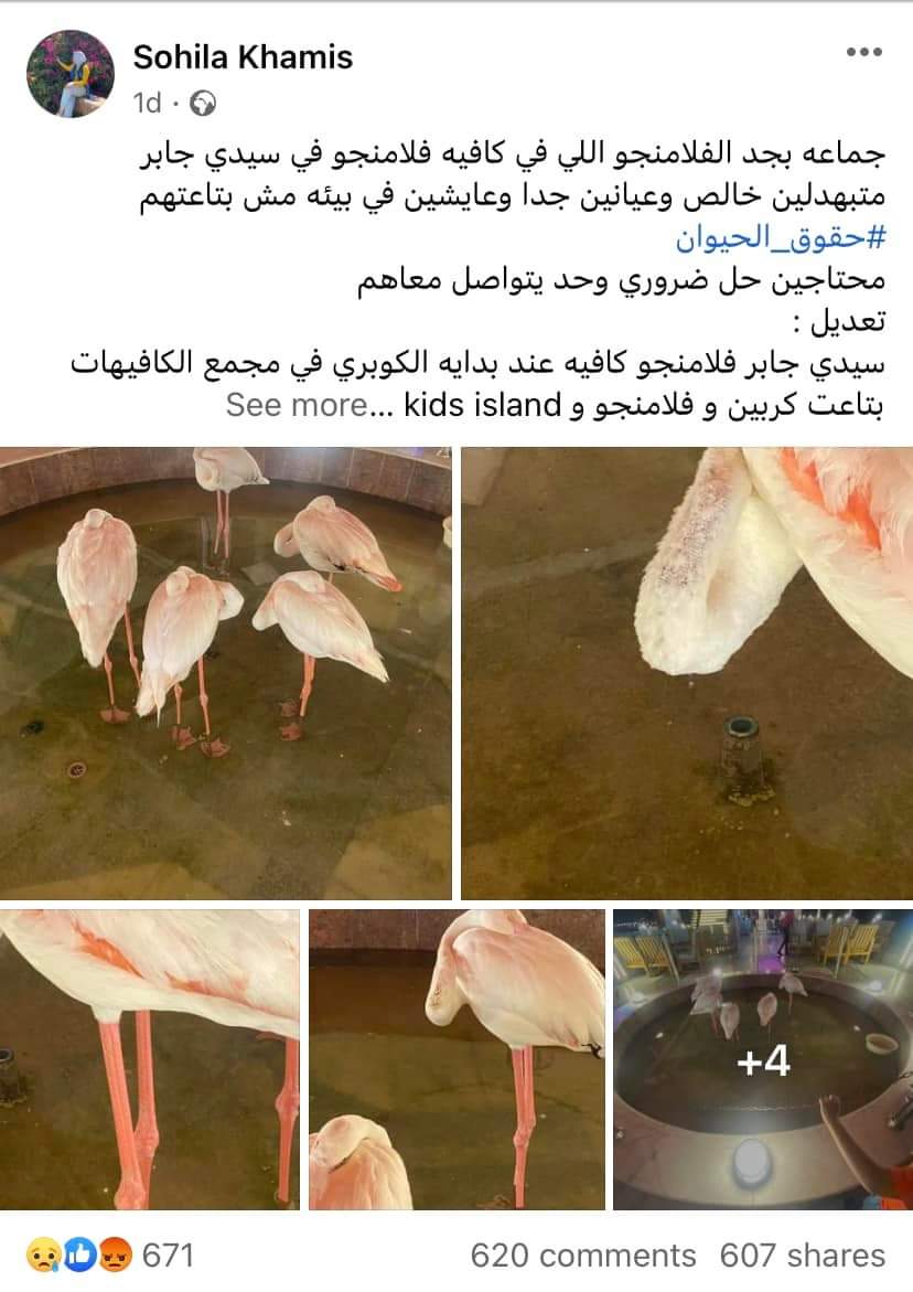 كانت صفحات موقع التواصل الاجتماعي فيس بوك، قد نشرت بلاغات واستغاثات لوجود طيور الفلامنجو تعاني من الإهمال في أحد كافيهات منطقة سيدي جابر مطالبين بإنقاذها، على الفور تحركت الأجهزة المعنية وعلى رأسها جهاز شئون البيئة، وجرى التوجه لمكان الكافية والتأكد من وجود الطيور وصحه البلاغات.