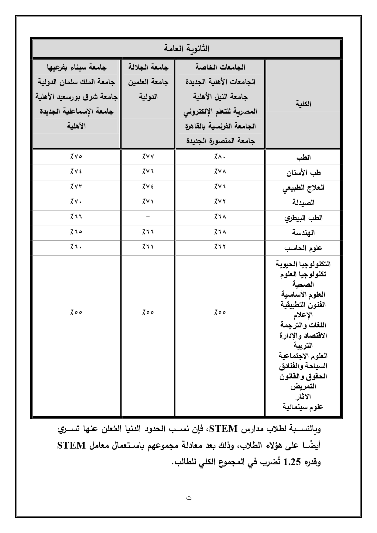 (الجلالة، العلمين الدولية، الملك سلمان الدولية، المنصورة الجديدة، المصرية للتعلم الإلكتروني الأهلية، النيل الأهلية، الأهلية الفرنسية في مصر، مصر للمعلوماتية، أسيوط الأهلية، المنصورة الأهلية، المنيا الأهلية، المنوفية الأهلية، حلوان الأهلية، الزقازيق الأهلية، بنها الأهلية، جنوب الوادي الأهلية، الإسكندرية الأهلية، بني سويف الأهلية، شرق بورسعيد الأهلية، الإسماعيلية الجديدة الأهلية).