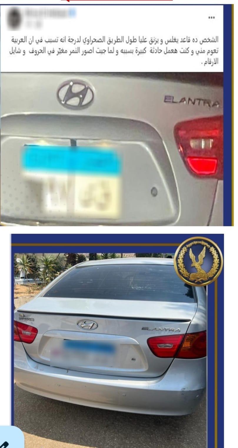 تابعت الأجهزة الأمنية، تداول منشور على إحدى الصفحات عبر موقع التواصل الإجتماعى "فيس بوك"متضمنًا تضرر سيدة من قيام قائد إحدى السيارات الملاكى بمضايقتها أثناء قيادتها سيارتها بطريق (القاهرة - الإسكندرية الصحراوى) وتعقبها معرضًا حياتها للخطر، فضلًا عن تلاعبه باللوحات المعدنية الخاصة بسيارته.