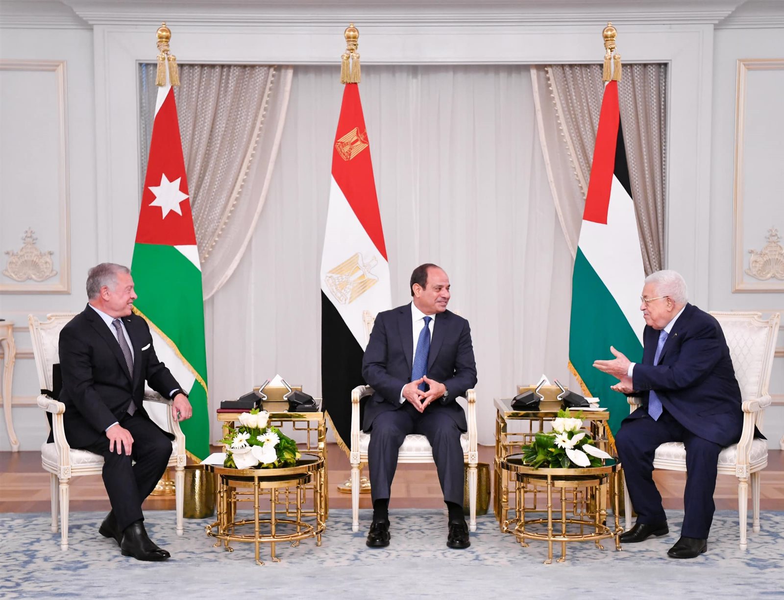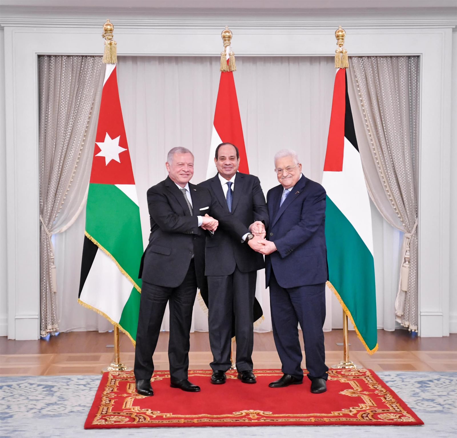 1. استضاف فخامة الرئيس عبد الفتاح السيسي رئيس جمهورية مصر العربية في قمة ثلاثية، صاحب الجلالة الهاشمية الملك عبد الله الثاني ابن الحسين ملك المملكة الأردنية الهاشمية، وفخامة الرئيس محمود عباس رئيس دولة فلسطين، في العلمين يوم ١٤ أغسطس/ آب ۲۰۲۳، وذلك لبحث تطورات القضية الفلسطينية في ضوء المستجدات الراهنة في أرض دولة فلسطين المحتلة، والأوضاع الإقليمية والدولية المرتبطة بها.