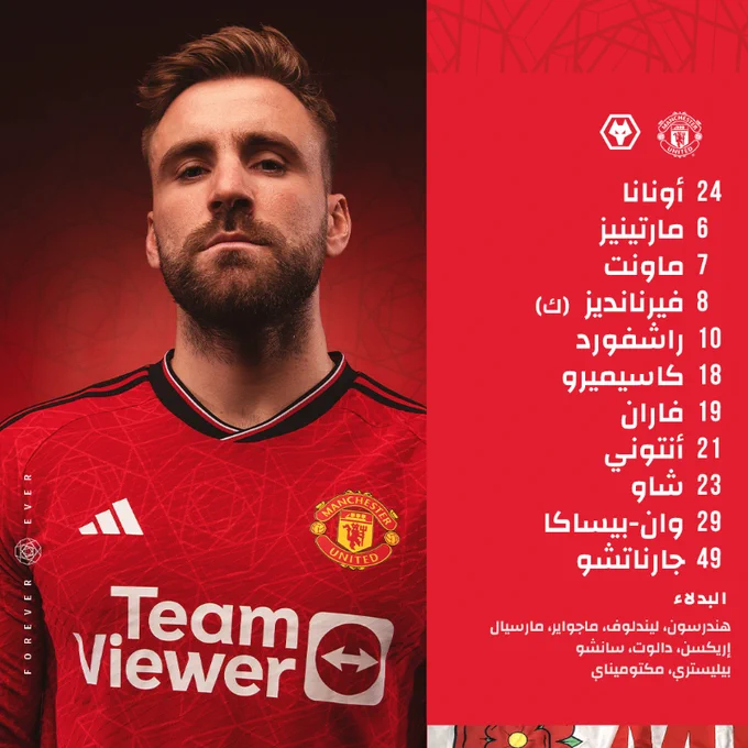 وكان الهولندي إيرك تين هاج تشكيل فريقه لمواجهة نظيره وولفرهامبتون، في ختام الجولة الأولى لمسابقة الدوري الإنجليزي الممتاز موسم 2023-2024.
