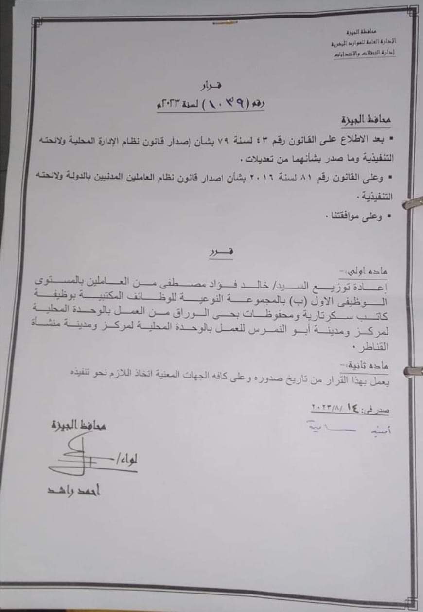 محافظ الجيزة يقرر نقل المهندس خالد فؤاد للعمل بمركز ومدينة منشأة القناطر (مستند)