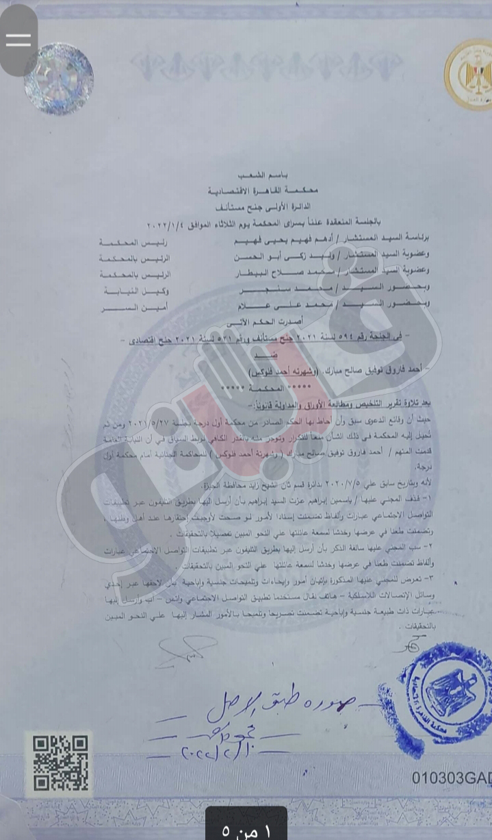 حصلت فيتو على صورة من الحكم الذي تسبب في حبس الفنان أحمد فلوكس سنتين وغرامة 200 ألف جنيه حكما نهائيا بتهمة سب وقذف بطلة مصر في السلة ياسمين إبراهيم، وترحيله إلى سجن وادي النطرون لقضاء مدة حبسه في القضية 594 لسنة 2021 جنح مستأنف الاقتصادية، عقب إنهاء كافة الإجراءات القانونية اللازمة والتوقيع على نماذج الحبس داخل قسم شرطة العجوزة.