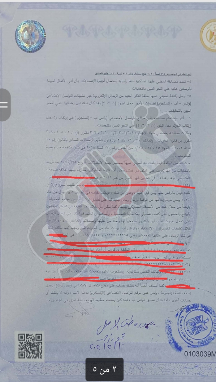 كما سب المجني عليها بأن أرسل لها عن طريق التليفون عبر تطبيقات مواقع التواصل الاجتماعي عبارات تضمنت طعنا في عرضها وخدشا لسمعة عائلتها وتعرض للمجني عليها المذكورة باتيان بتلميحات وإيحاءات جنسية وإباحية بأن لاحقها عبر إحدى وسائل الاتصالات اللاسلكية - هاتف نقال- مستخدما تطبيق التواصل الاجتماعي الواتس اب وأرسل اليها عبارات ذات طبيعة جنسية تضمنت تلميحات على النحو المبين بالتحقيقات وتعمد مضايقة المجنى عليها المذكورة سلفا بإساءة استعمال أجهزة الاتصالات بأن آتي بالأعمال المبينة بالوصفين عاليه على الوصف المبين بالتحقيقات وأرسل بكثافة للمجني عليها سالفة الذكر الرسائل الإلكترونية عبر تعليقات التواصل الاجتماعي (واتس اب - انستجرام) له.