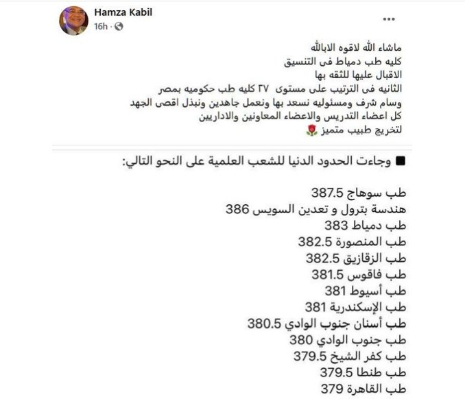 وكتب الدكتور حمزة قابيل عميد طب دمياط تدوينة عن تصدر الكلية لتنسيق كليات الطب فقال: " ماشاء الله لاقوه الابالله.. كليه طب دمياط فى التنسيق الاقبال عليها للثقه بها الثانية فى الترتيب على مستوى ٢٧ كليه طب حكوميه بمصر وسام شرف ومسئوليه نسعد بها ونعمل جاهدين ونبذل اقصى الجهد كل اعضاء التدريس والاعضاء المعاونين والاداريين لتخريج طبيب متميز"