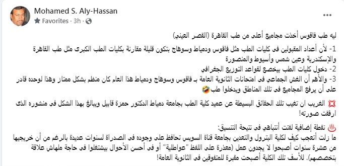 وتابع محمد سيد علي قائلًا: "معلومة لسه عارفها... طب دمياط وطب فاقوس مفتحتين يا دوب فى أواخر 2021 يعنى لسه مخرجوش طبيب واحد عشان نحكم على مستواهم"