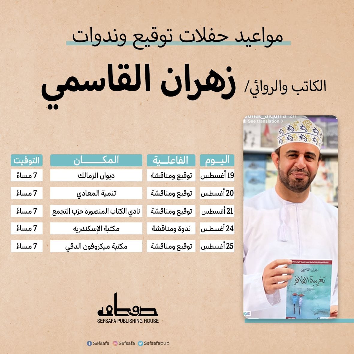 وأعلنت دار صفصافة للنشر، عن مواعيد حفلات التوقيع والندوات التى تستضيف فيها الروائي العُماني زهران القاسمي وأماكنها، بداية من يوم السبت 19 أغسطس وحتى يوم الجمعة 25 أغسطس الجاري، وتبدأ الفعالية فى الساعة السابعة مساء، بكل من مكتبة ديوان بالزمالك، مكتبة تنمية في المعادي، نادي الكتاب المنصورة حزب التجمع، مكتبة الإسكندرية، ومكتبة ميكرفون بالدقي.