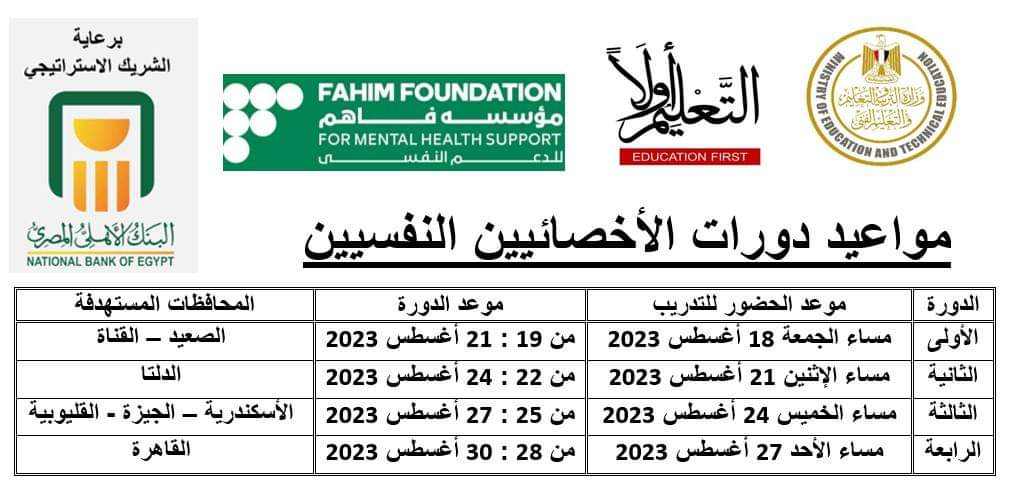 أعلنت وزارة التربية والتعليم والتعليم الفني عن مواعيد دورات تدريب الأخصائيين النفسيين بالمدارس الرسمية والمتميزة للغات.