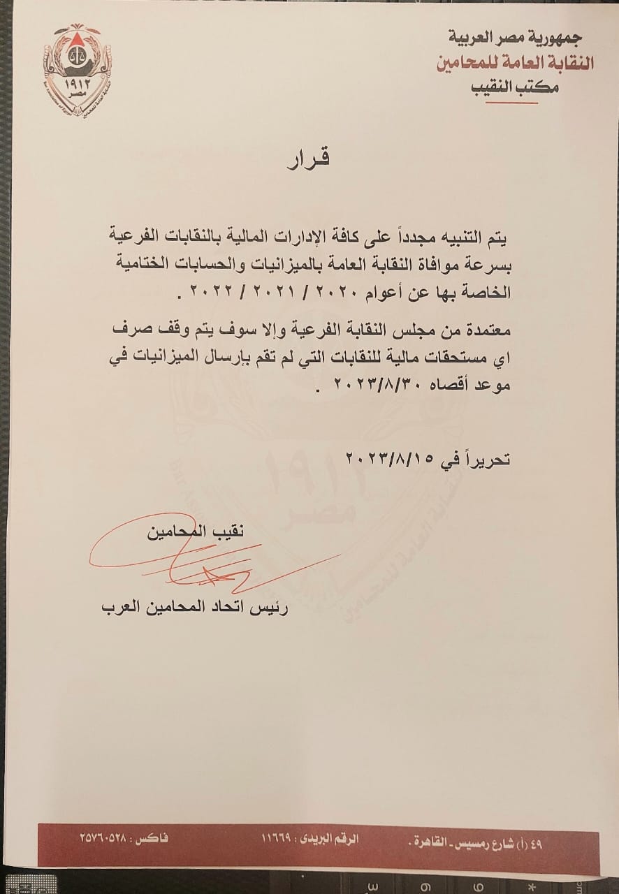 نقيب المحامين ينبه على النقابات الفرعية بإرسال الميزانيات من عام 2020 إلى 2022