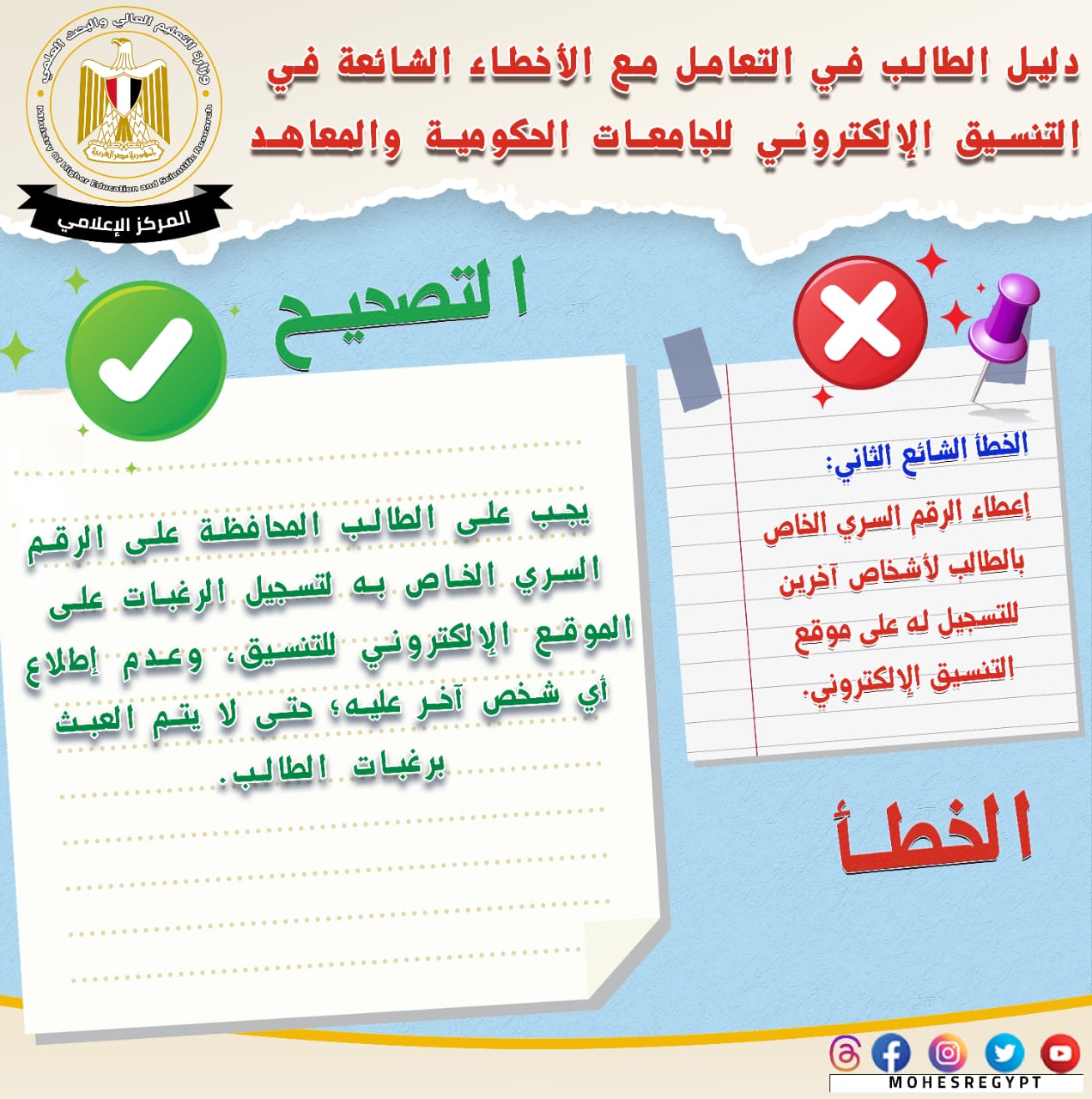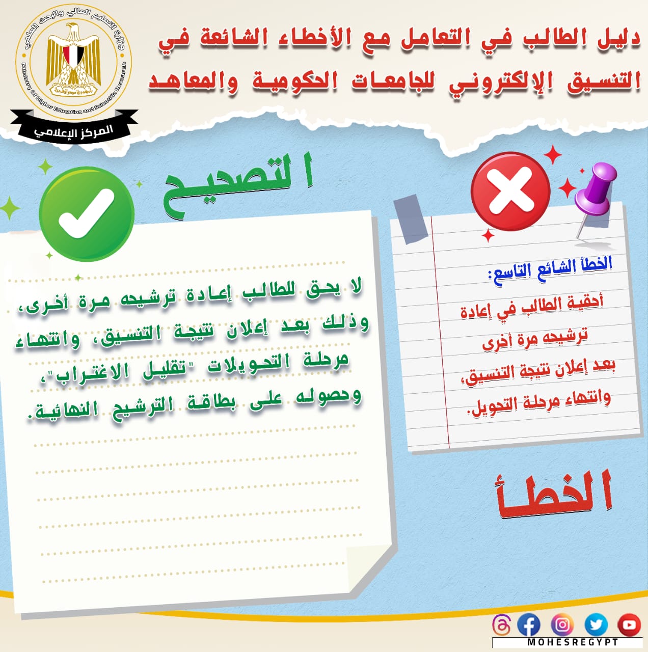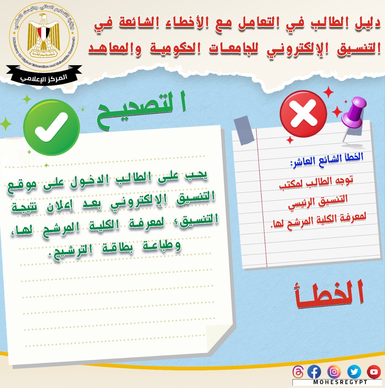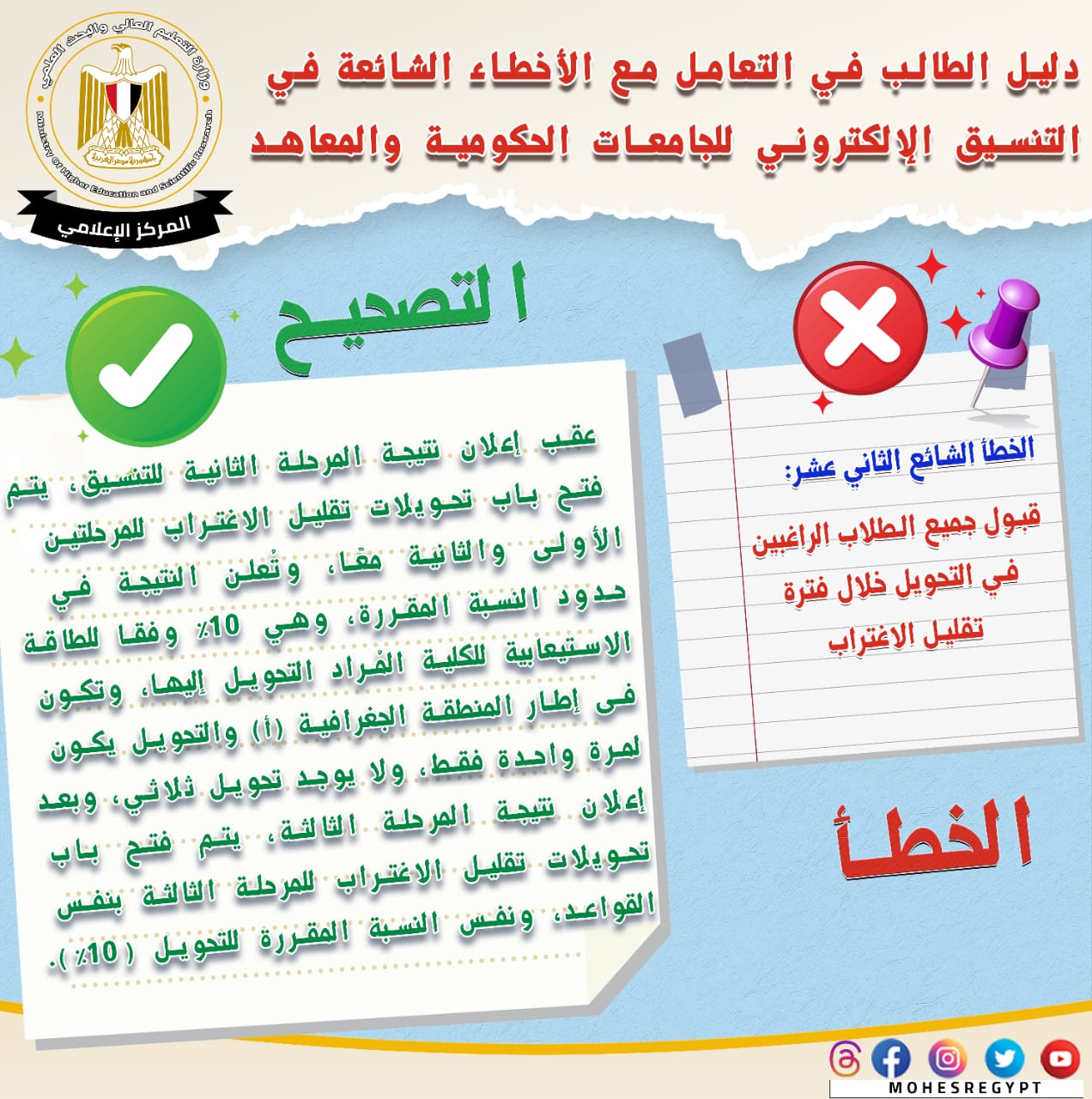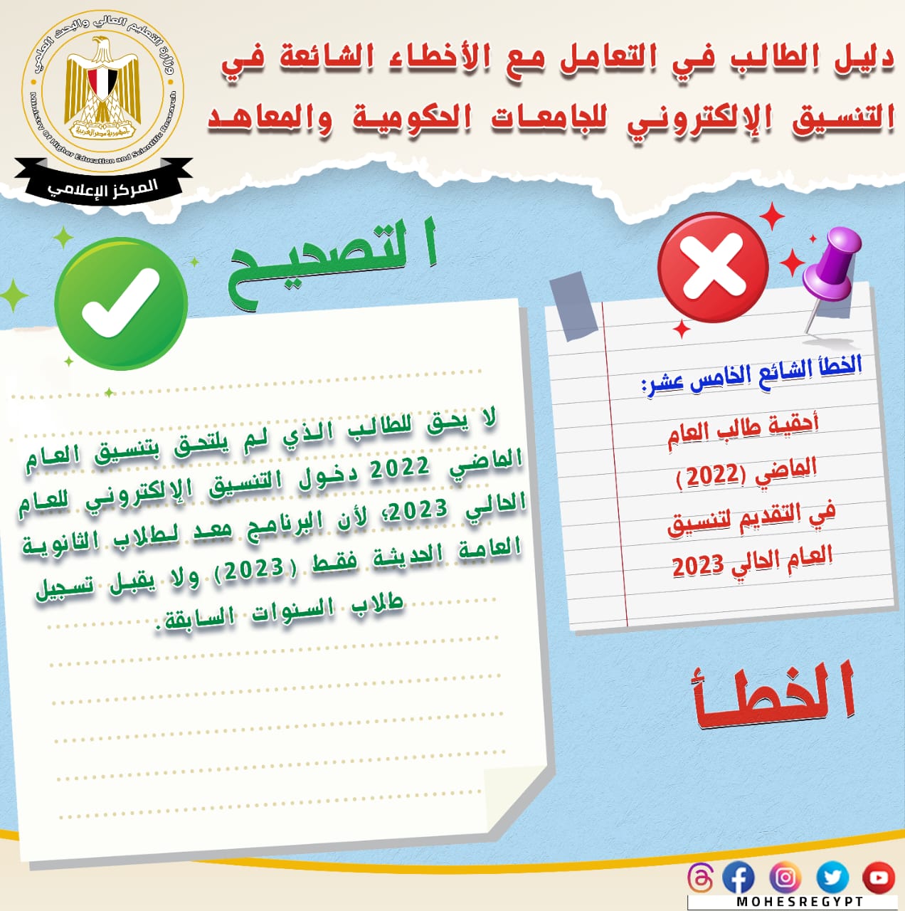 تنسيق المرحلة الثانية 2023، قامت وزارة التعليم العالي والبحث العلمي بإعادة نشر دليل التعامل مع الأخطاء الشائعة في التنسيق الإلكتروني، وذلك تزامنًا مع بدء المرحلة الثانية لتنسيق القبول بالجامعات الحكومية والمعاهد، خلال الفترة من 15 إلى 19 أغسطس الجاري؛ لتعريف الطلاب بكافة المعلومات التي تساعدهم أثناء مراحل التنسيق المُختلفة من خلال حملة التوعية التي تقدمها الوزارة.