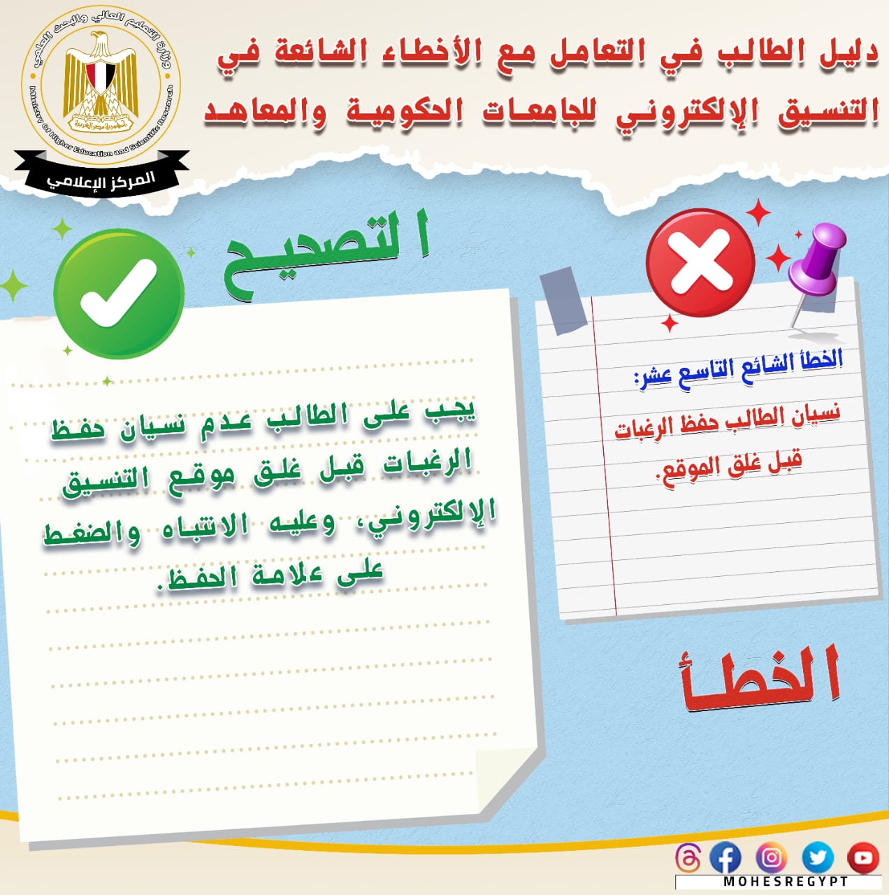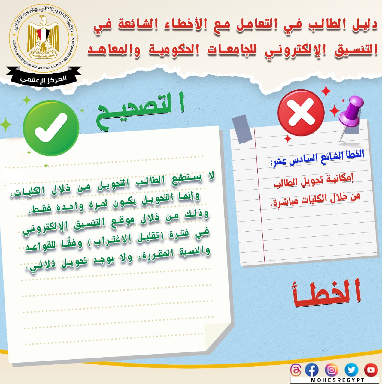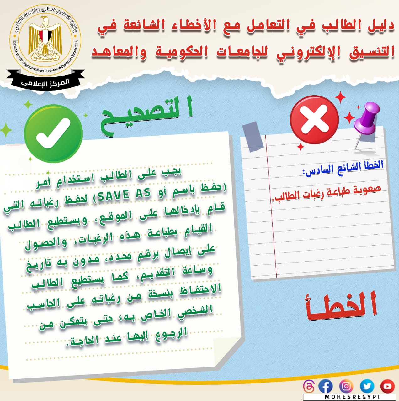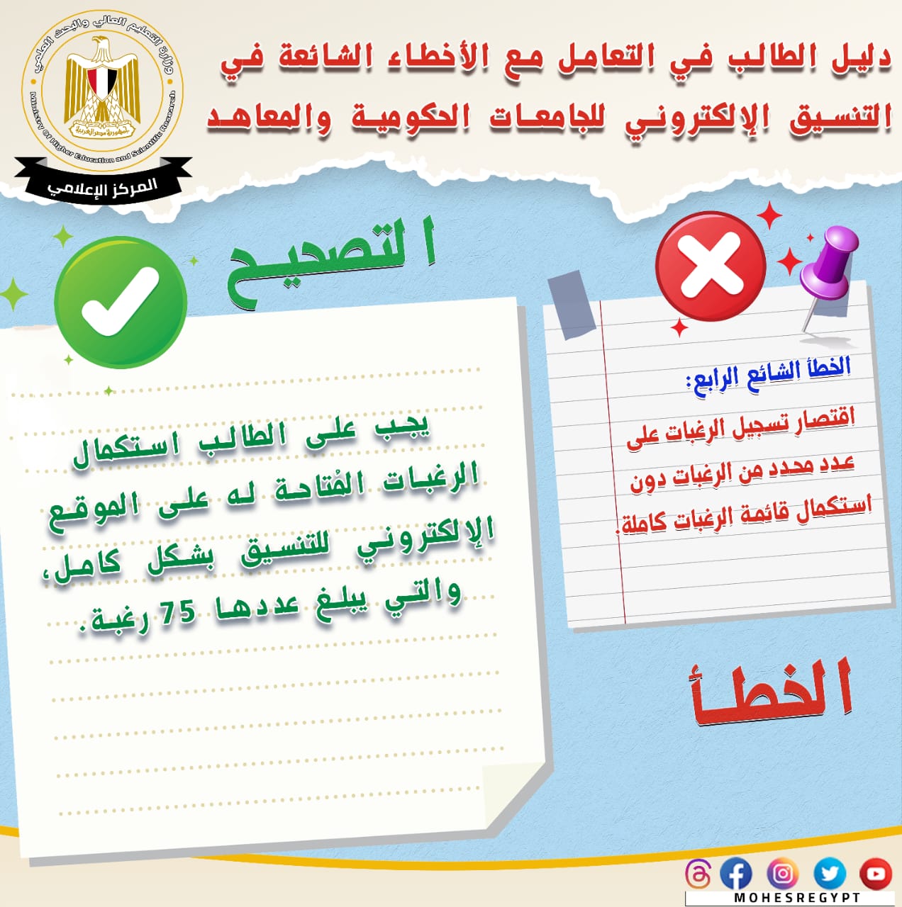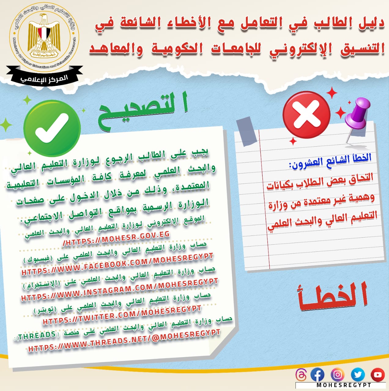 يذكر أنه يتم نشر الأدلة الإرشادية وكافة الوسائل التوضيحية عبر الموقع الإلكتروني وحسابات وزارة التعليم العالي والبحث العلمي على مواقع التواصل الاجتماعي التالية: