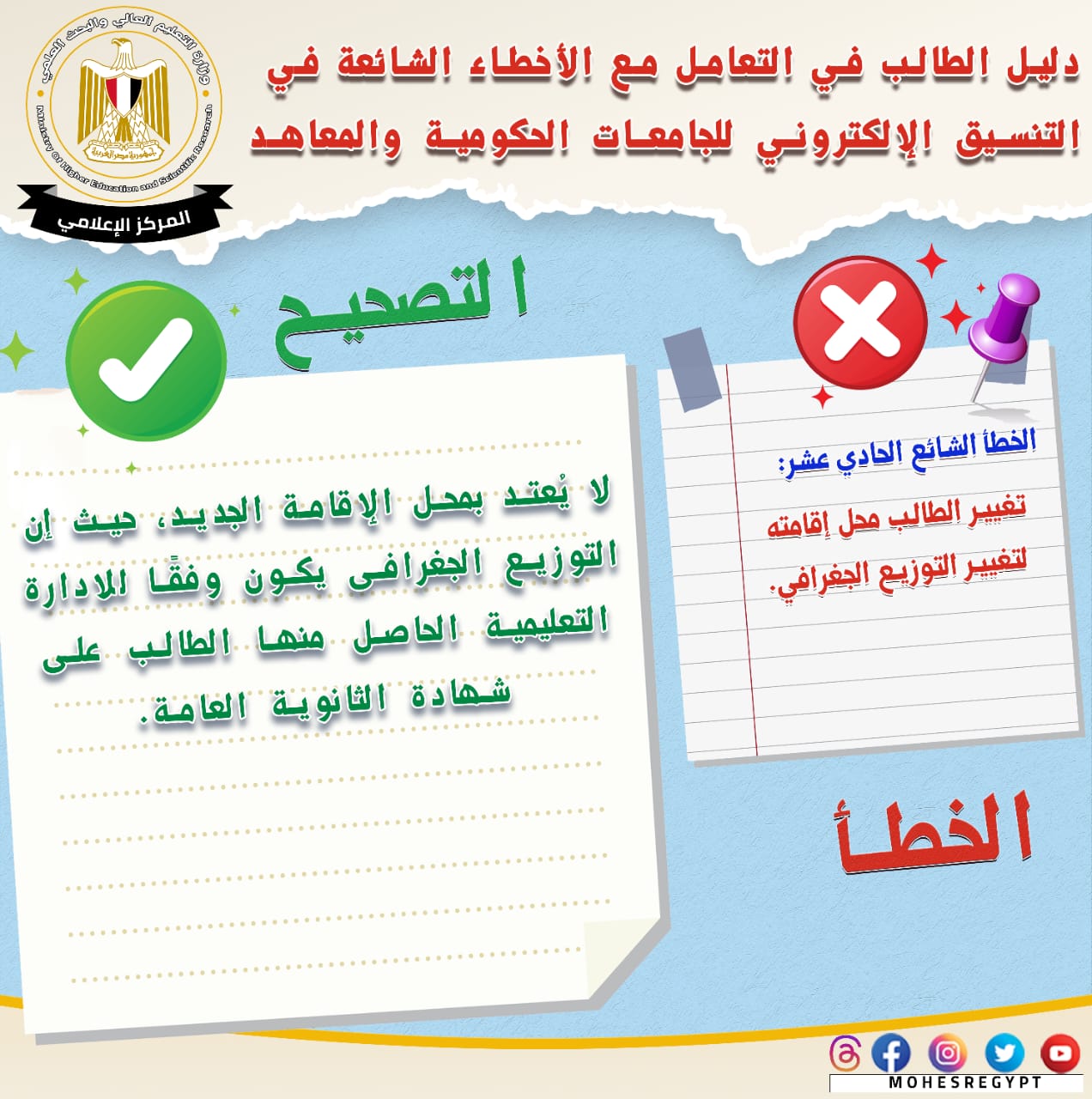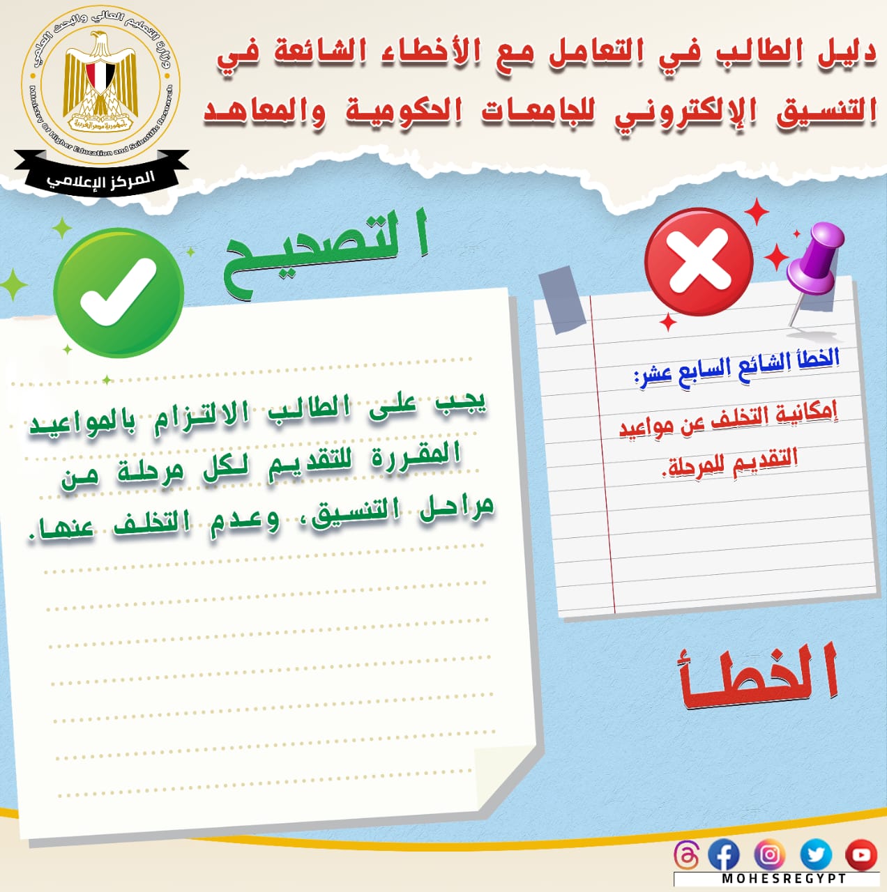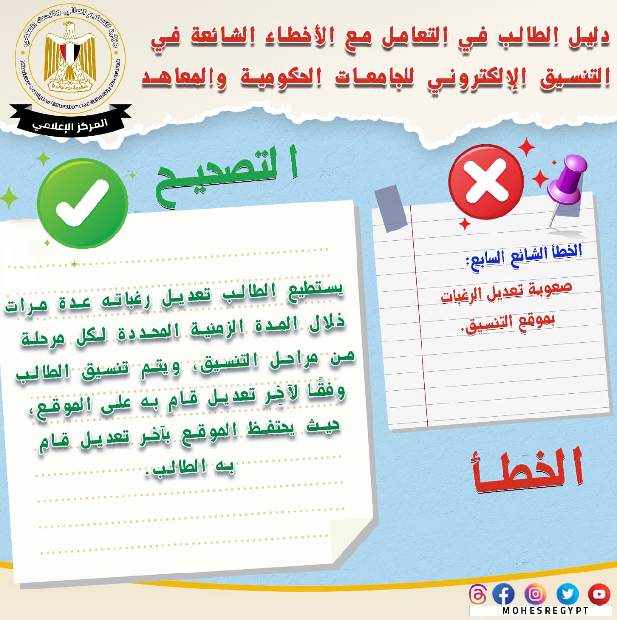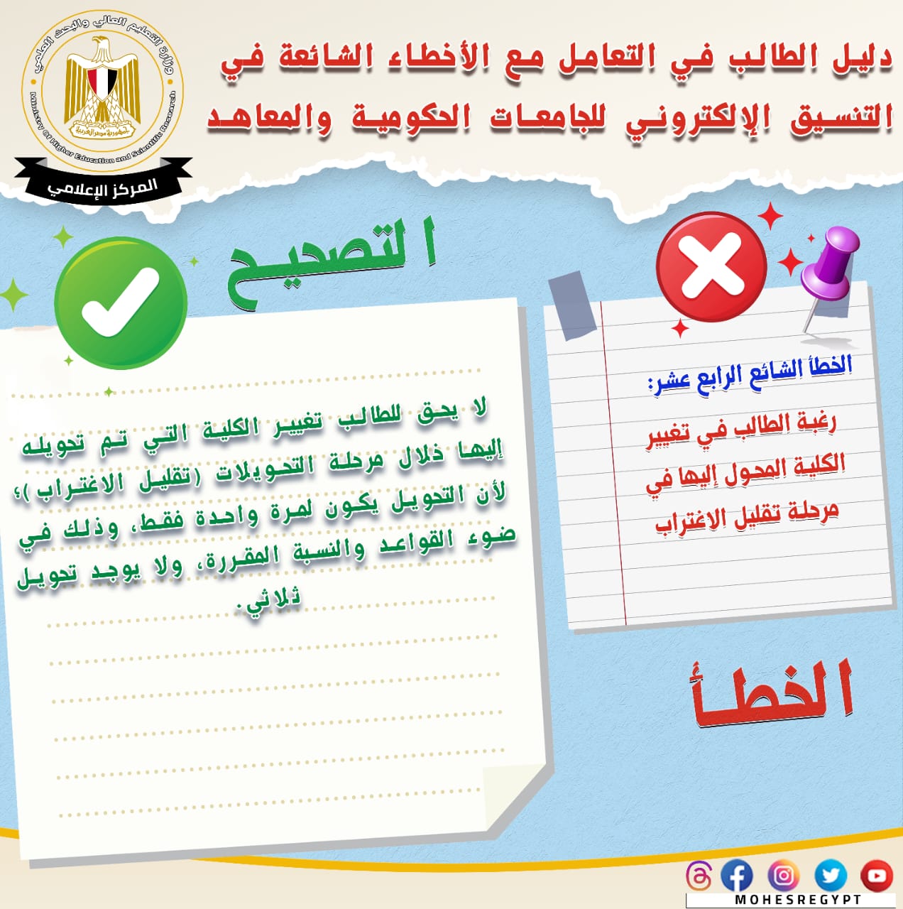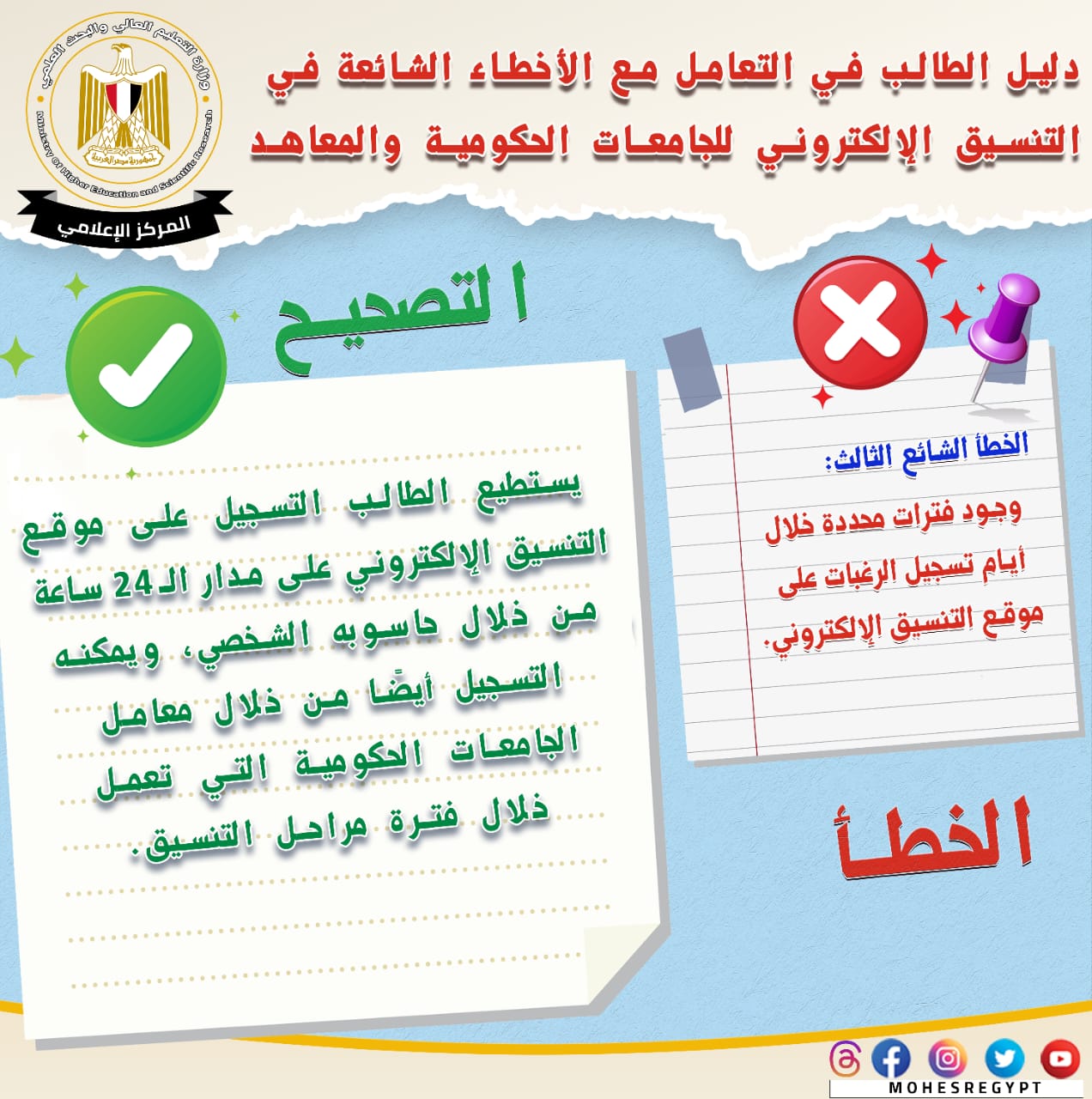 يذكر أنه يتم نشر الأدلة الإرشادية وكافة الوسائل التوضيحية عبر الموقع الإلكتروني وحسابات وزارة التعليم العالي والبحث العلمي على مواقع التواصل الاجتماعي التالية: