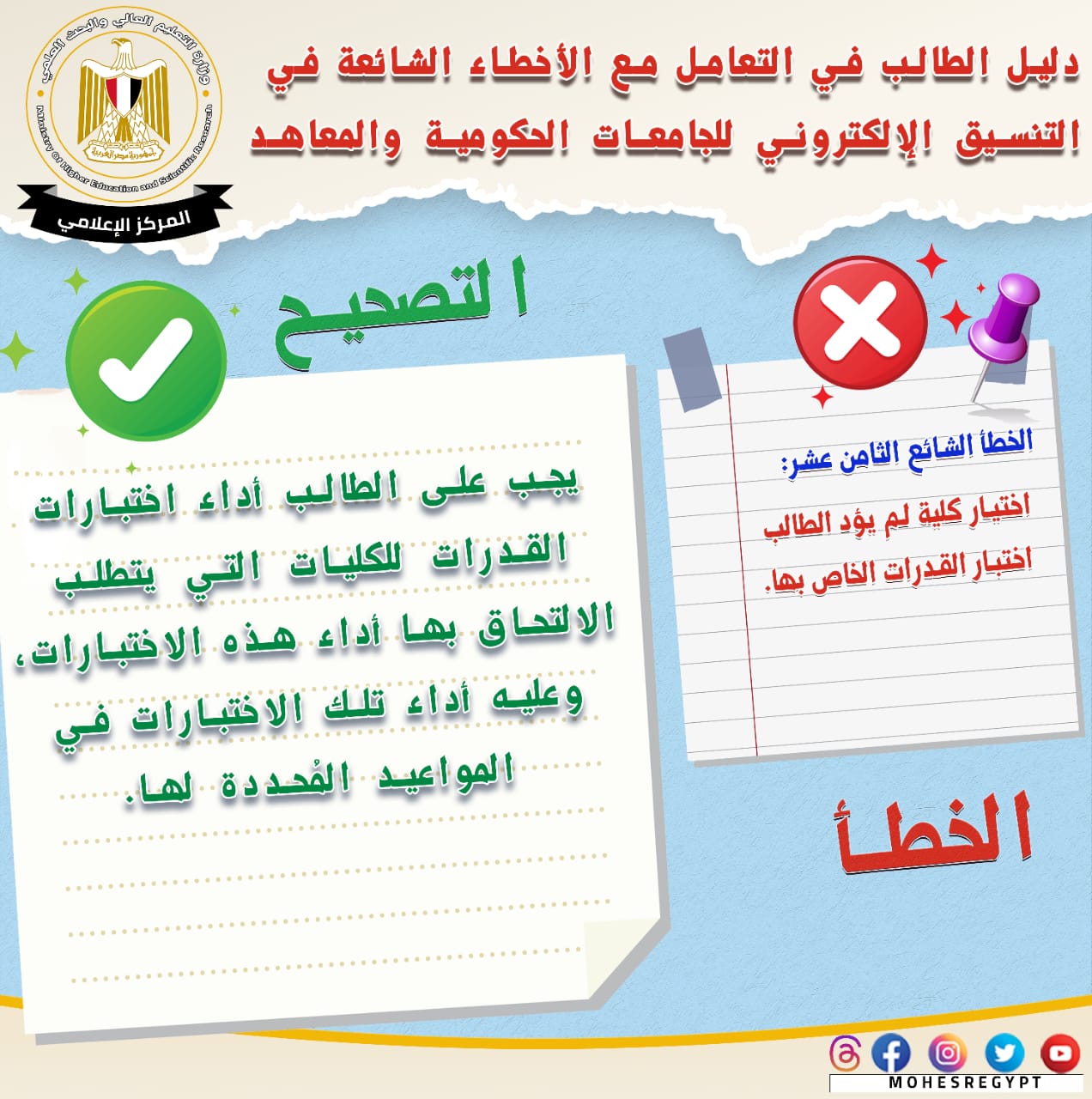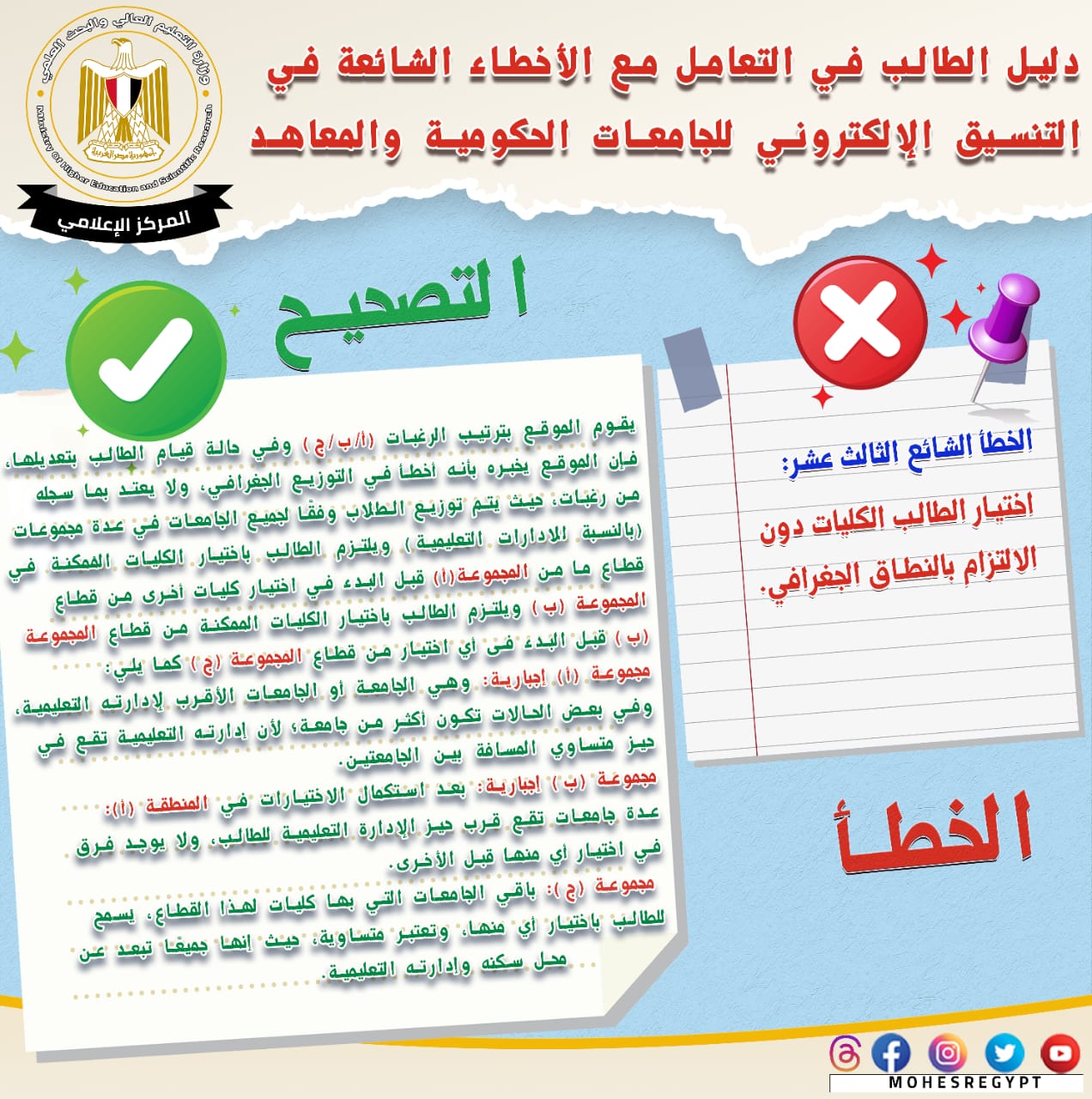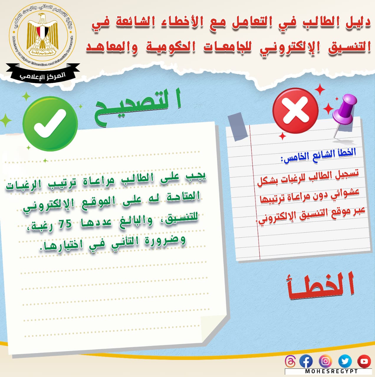 وأضاف المتحدث الرسمي أن الدليل الحالي يتضمن أبرز الأخطاء الشائعة التي يقع فيها طلاب الثانوية العامة، وكيفية التعامل الصحيح مع هذه الأخطاء؛ لتجنب الوقوع فيها خلال فترة التنسيق للالتحاق بالجامعات الحكومية والمعاهد.