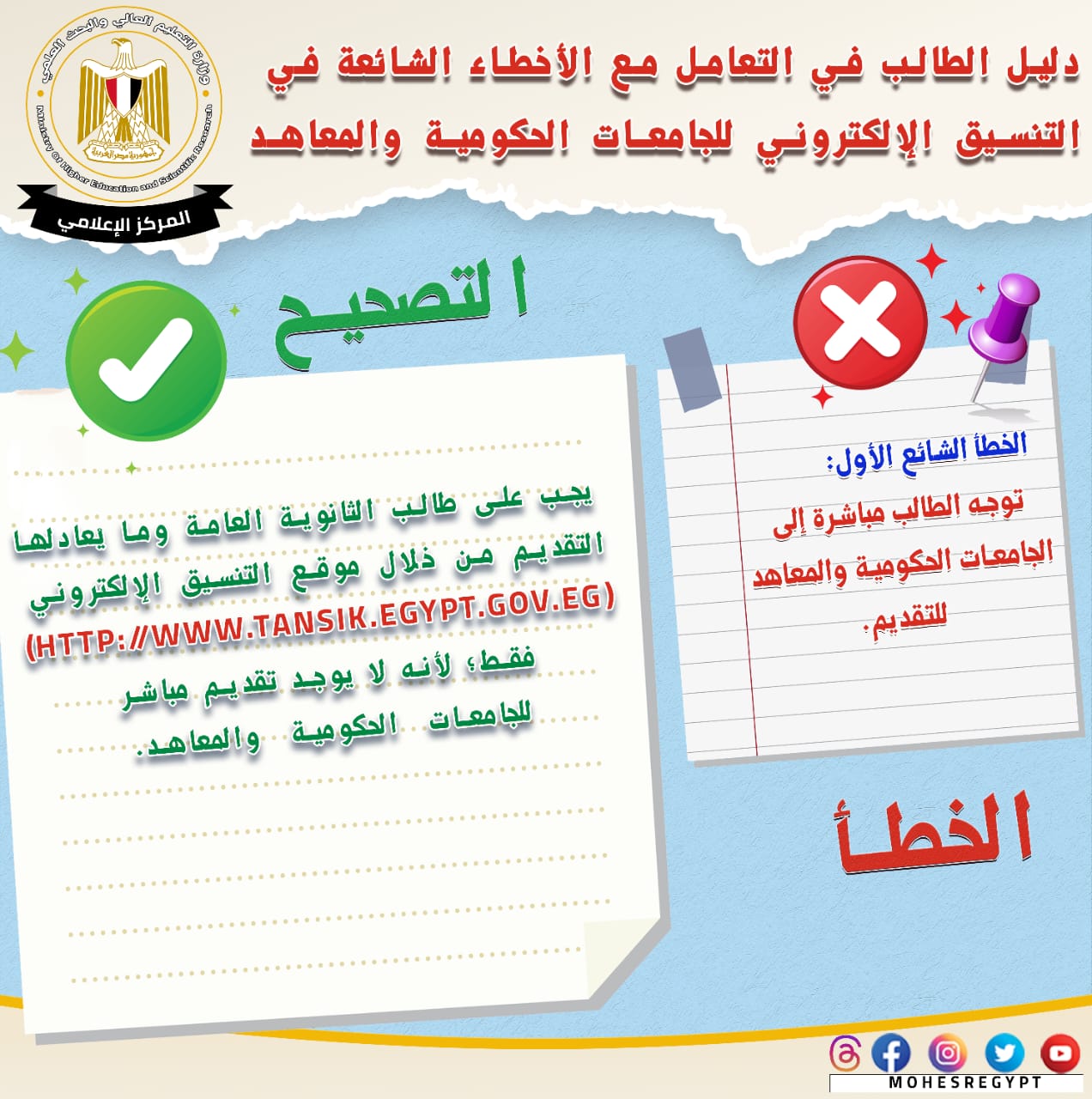 وصرح د. عادل عبدالغفار المستشار الإعلامي والمتحدث الرسمي أن جهود الوزارة مستمرة في تقديم حملة التوعية؛ لتعريف طلاب الثانوية العامة بكيفية التنسيق للقبول بالجامعات الحكومية والمعاهد من خلال موقع التنسيق الإلكتروني https://tansik.digital.gov.eg