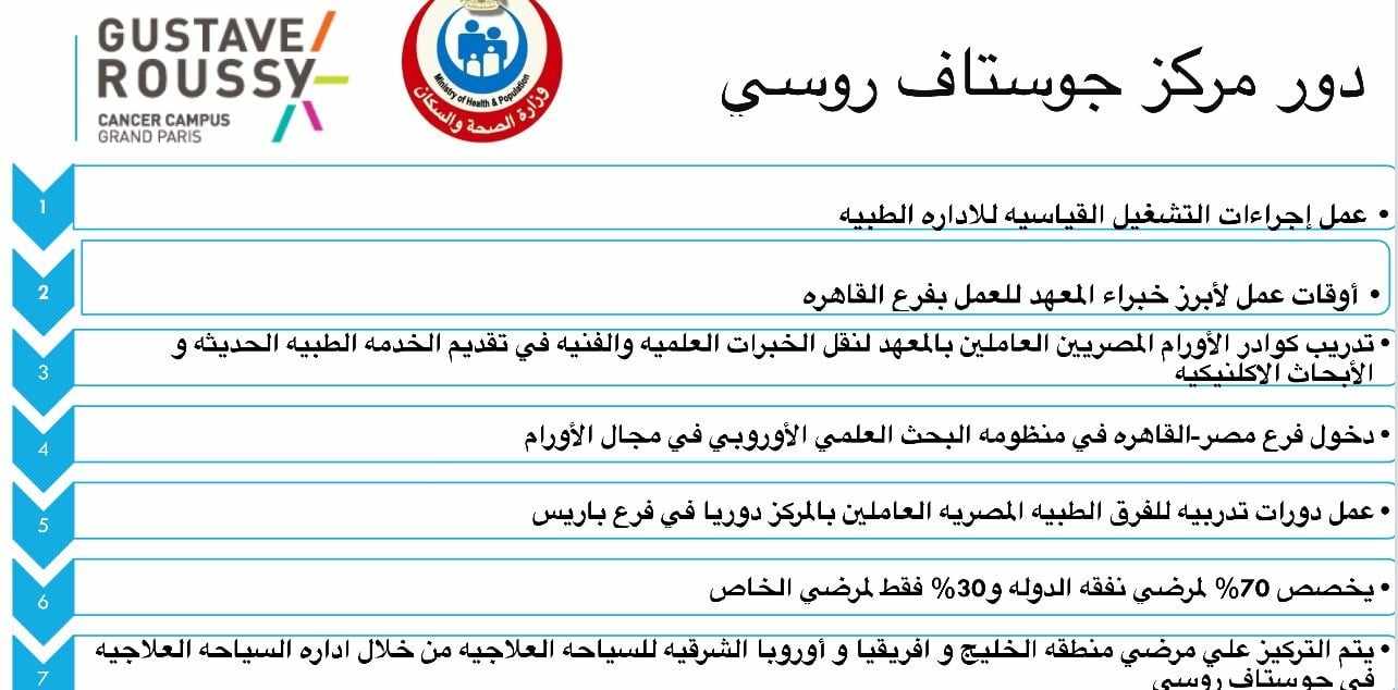 جدير بالذكر أن معهد «جوستاف روسي» هو أول مركز تم إنشاءه لمكافحة السرطان في أوروبا، وهو الأول في نشر الأبحاث العلمية، والأول على مستوى أوروبا في علاج السرطان، ويحتل المركز الثالث كأفضل مستشفى للسرطان في العالم المركز، وبموجب اتفاقية التعاون سيكون تنفيذ المركز هو الوحيد لـ«جوستاف روسي» خارج فرنسا والمركز الرئيسي في أفريقيا والشرق الأوسط ومنطقة الخليج العربي.