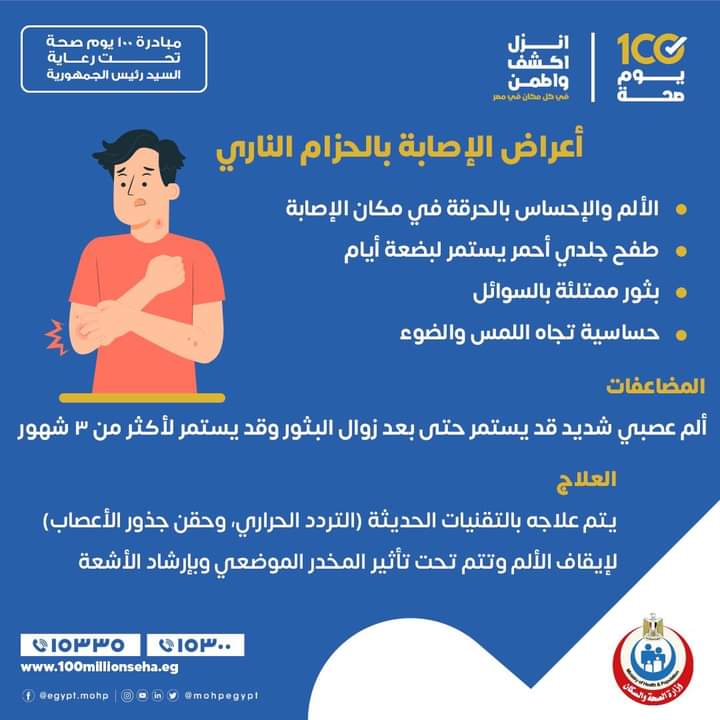 وأوضحت وزارة الصحة أن علاج الحزام الناري يكون من خلال التقنيات الحديثة منها التردد الحراري أو حقن جذور الأعصاب لإيقاف الألم ويتم ذلك تحت تأثير مخدر موضعي وإرشاد الأشعة.
