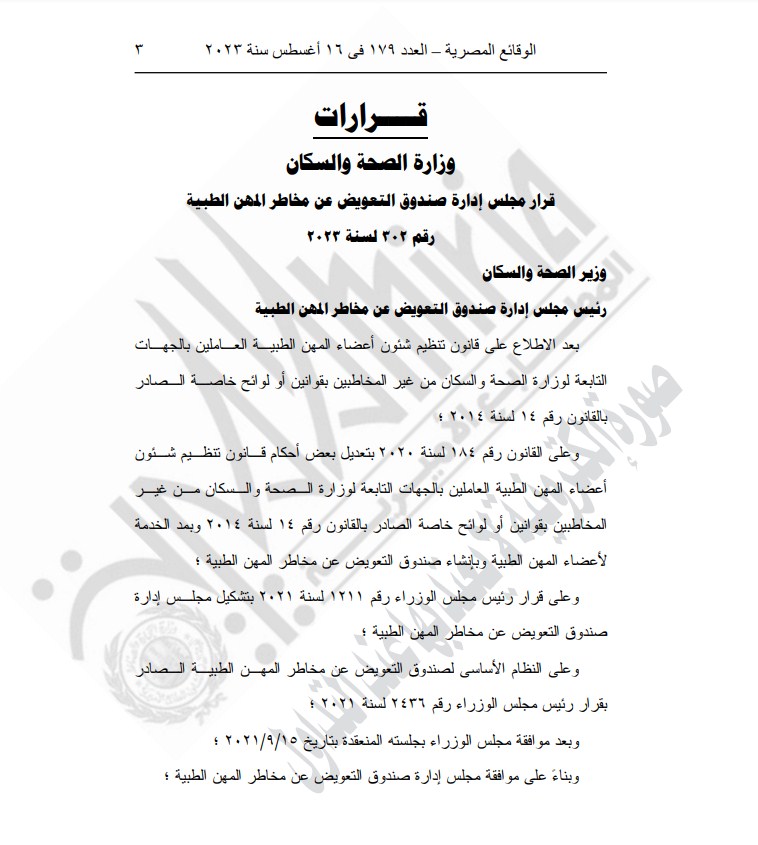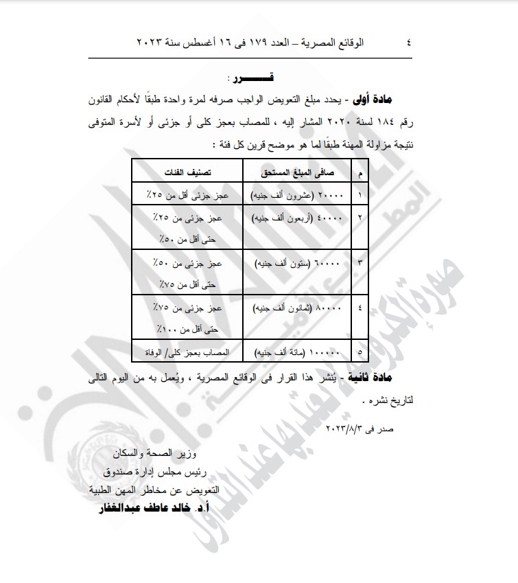 نشرت جريدة الوقائع المصرية في عددها رقم 179، الصادر في 16 أغسطس 2023، قرار وزارة الصحة والسكان "مجلس إدارة صندوق التعويضات عن مخاطر المهن الطبية" رقم 302 لسنة 2023، بشأن تحديد مبلغ التعويض الواجب صرفه لمرة واحدة للمصاب أو المتوفى لمزاولة مهنة الطب.