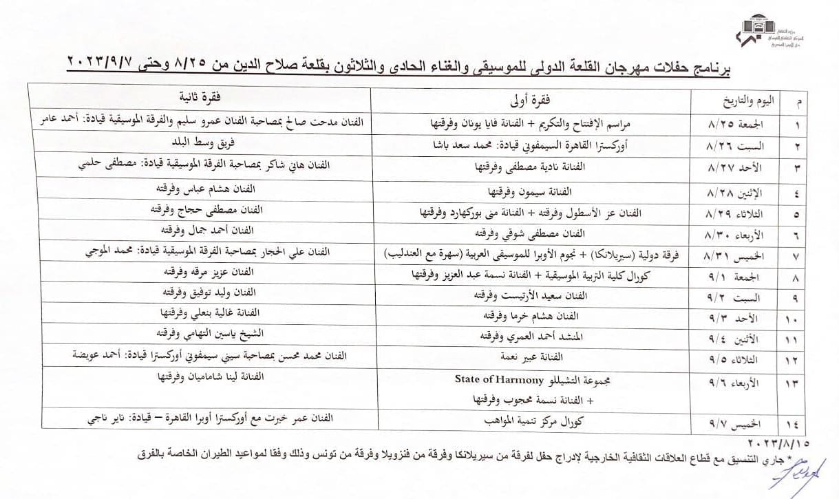 جدول حفلات مهرجان القلعة للموسيقى والغناء 2023