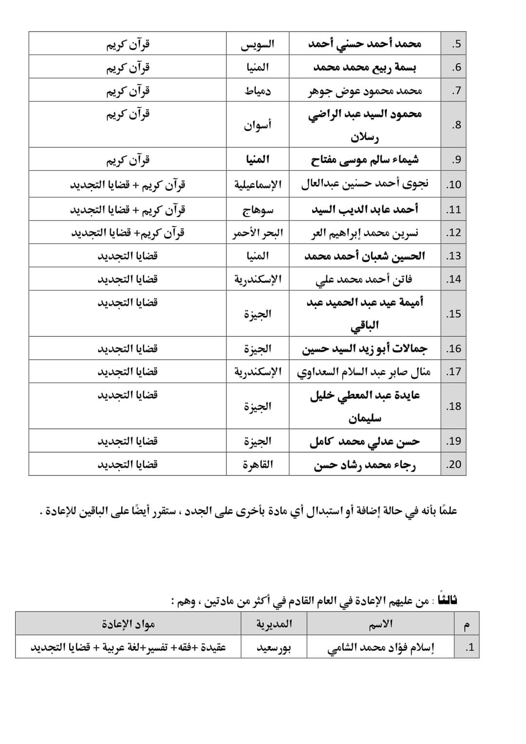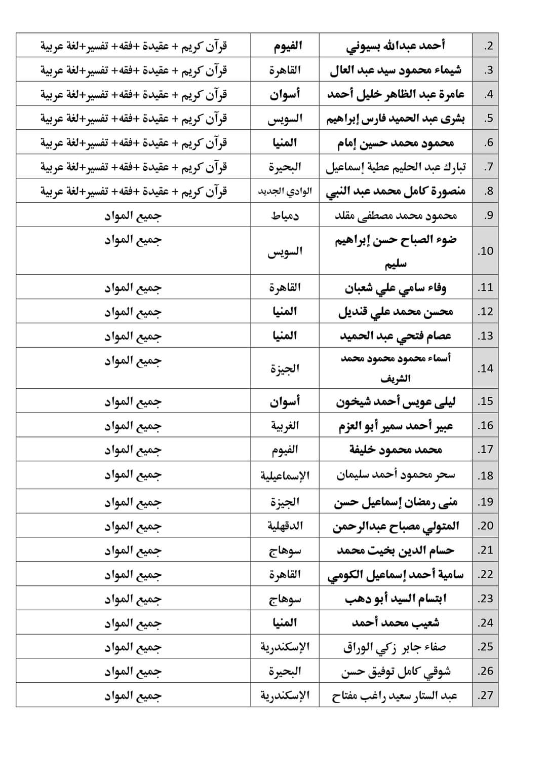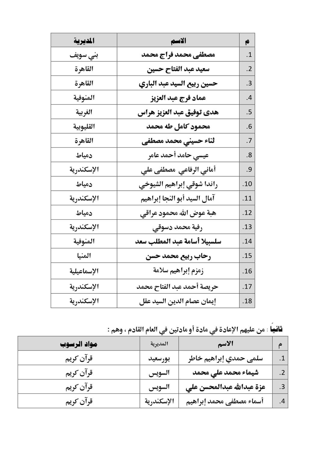 نشرت وزارة الأوقاف أسماء الناجحين بالدور الثاني من الدارسين والدارسات بالفرقة الثانية بمراكز إعداد محفظي القرآن الكريم للعام الدراسي 2022م-2023م، وهم: