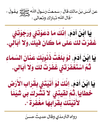 (يا عِبَادِي، إنَّكُمْ لَنْ تَبْلُغُوا ضَرِّي فَتَضُرُّونِي، وَلَنْ تَبْلُغُوا نَفْعِي فَتَنْفَعُونِي، يا عِبَادِي، لو أنَّ أَوَّلَكُمْ وَآخِرَكُمْ وإنْسَكُمْ وَجِنَّكُمْ، كَانُوا علَى أَتْقَى قَلْبِ رَجُلٍ وَاحِدٍ مِنكُمْ؛ ما زَادَ ذلكَ في مُلْكِي شيئًا، يا عِبَادِي، لوْ أنَّ أَوَّلَكُمْ وَآخِرَكُمْ وإنْسَكُمْ وَجِنَّكُمْ، كَانُوا علَى أَفْجَرِ قَلْبِ رَجُلٍ وَاحِدٍ؛ ما نَقَصَ ذلكَ مِن مُلْكِي شيئًا).