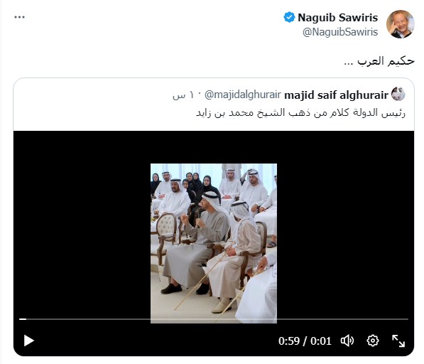 محمد بن زايد، وجه رجل الأعمال، المهندس نجيب ساويرس، رسالة لرئيس دولة الإمارات العربية الشيخ محمد بن زايد آل نهيان، ووصفه بأنه حكيم العرب، وذلك بعد اللقاء الذي عقده بن زايد، بشأن مؤتمر COP 28.
