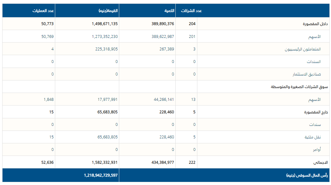 كما صعد مؤشر الشركات الصغيرة والمتوسطة " إيجي إكس 70 متساوي الأوزان " بنسبة 0.1% عند مستوى 3638 نقطة، وقفز مؤشر " إيجي إكس 100 متساوي الأوزان" بنسبة 0.13% عند مستوى 5397 نقطة.