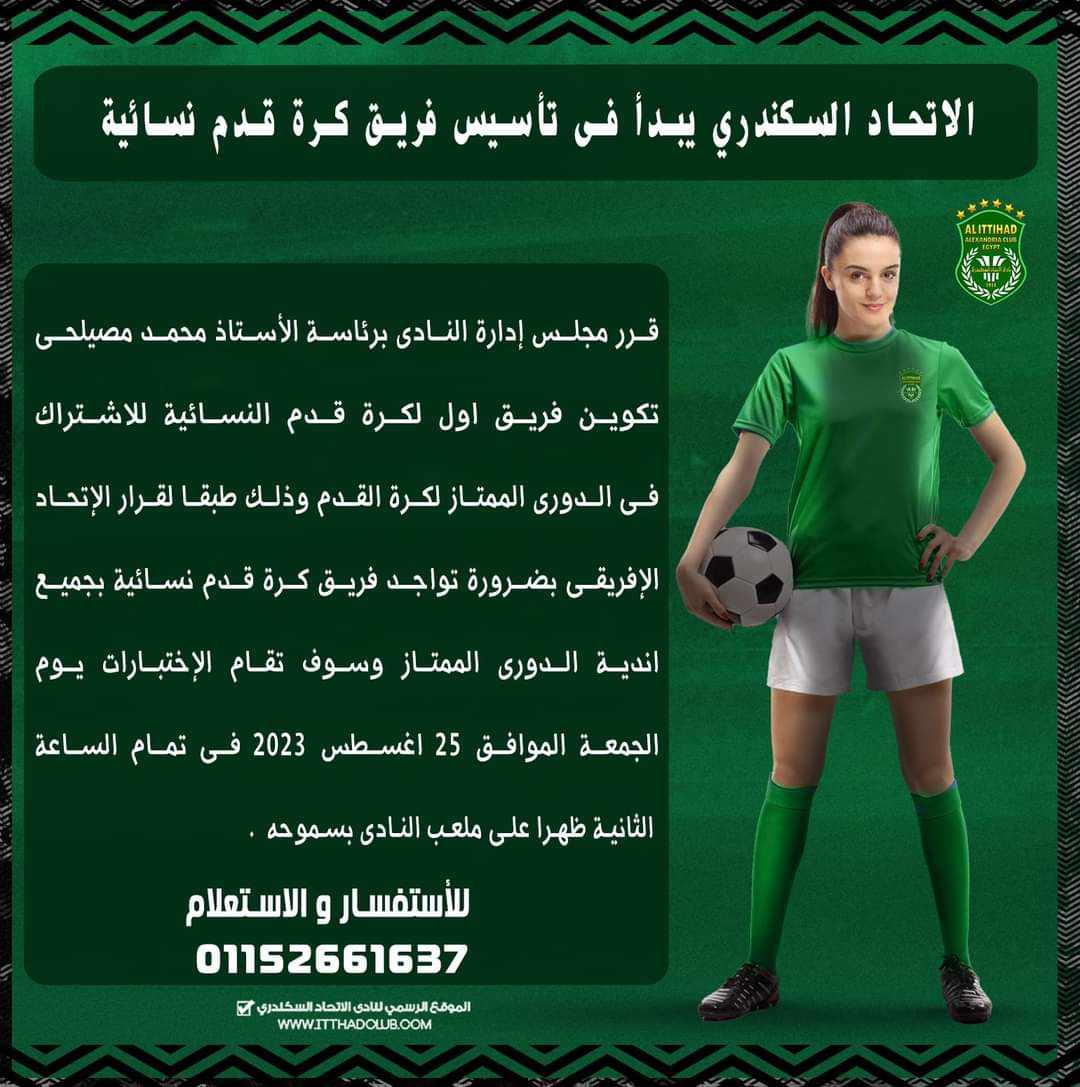 أعلن مجلس ادارة نادي الاتحاد السكندري برئاسة محمد مصيلحي بدأ تأسيس فريق اول لكرة القدم النسائية خلال الموسم الحالي للاشتراك بالدوري الممتاز.