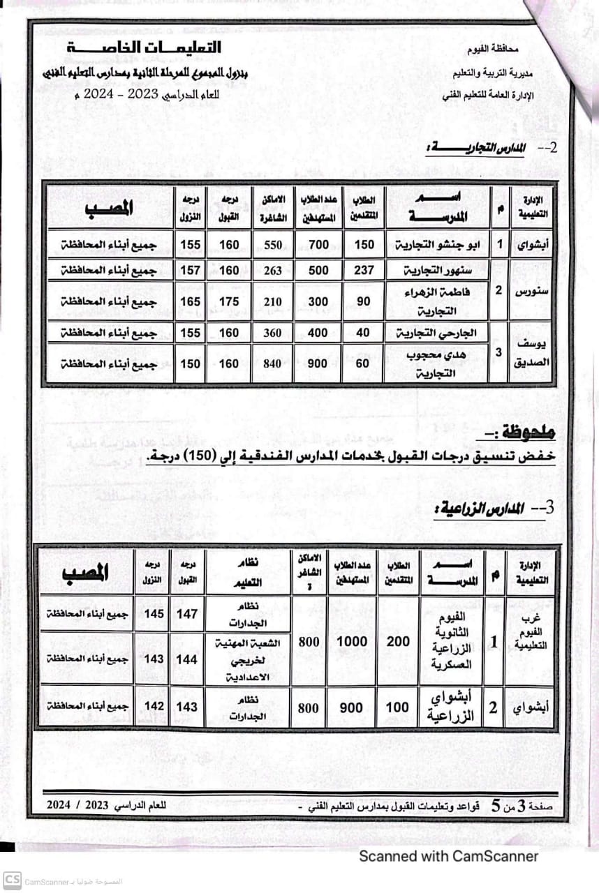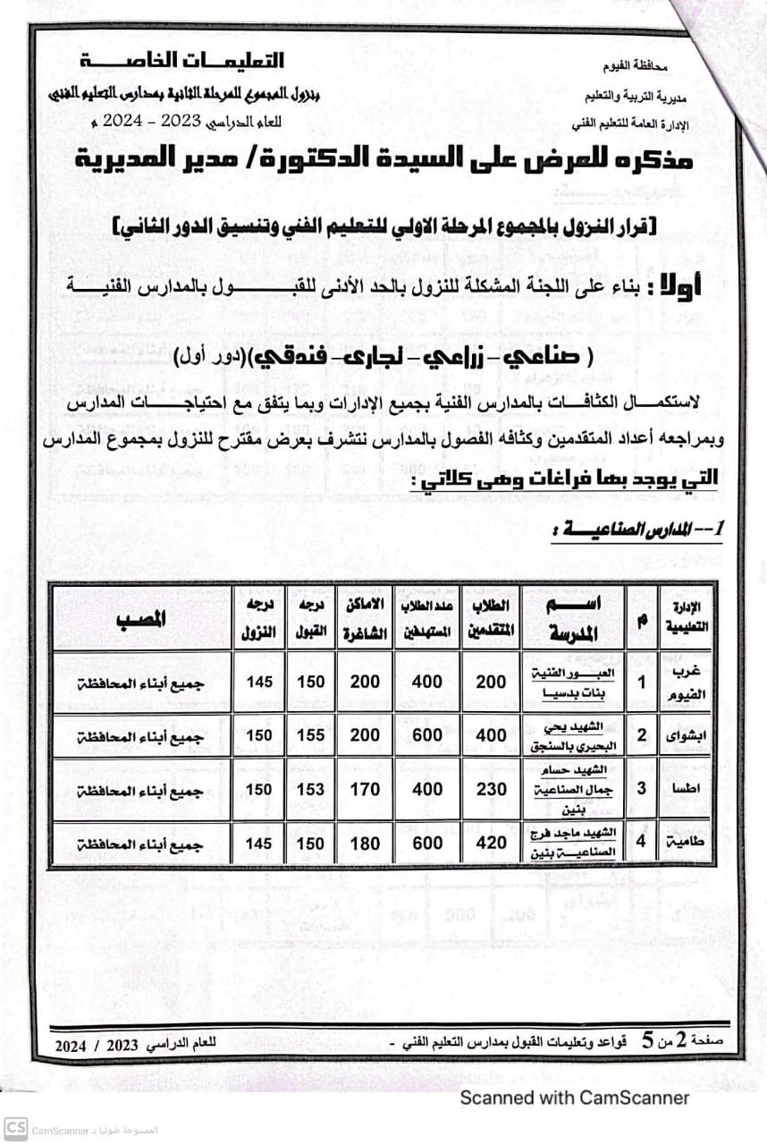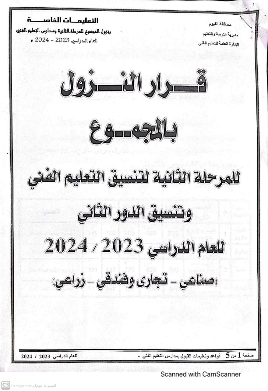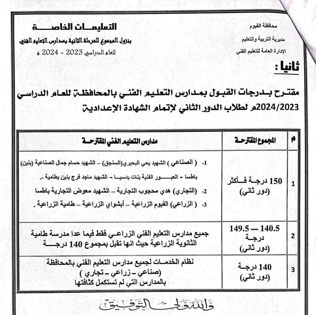 اعتمد الدكتور أحمد الأنصاري محافظ الفيوم، النزول بمجموع القبول بالصف الأول الثانوي بالتعليم الفني للعام الدراسي 2023/2024، ببعض المدارس التي لم تستكمل كثافاتها في المرحلة الأولى للتنسيق، وتراوحت درجات النزول ما بين 5 درجات، و10 درجات حسب الكثافة في كل مدرسة على حدة، وحسب المستهدف قبوله من الكلاب بالدوريات الأول والثاني للشهادة الإعدادية.