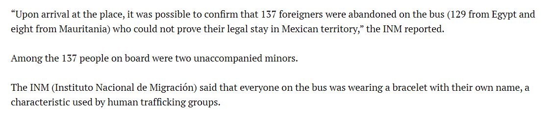 وأفادت الوكالة، بأنه عند الوصول إلى الموقع، تم التأكد من أن 137 أجنبيًا قد تم التخلي عنهم، وتم تركهم فى الحافلة (129 من مصر وثمانية من موريتانيا) ولم يتمكنوا من إثبات إقامتهم القانونية في الأراضي المكسيكية".