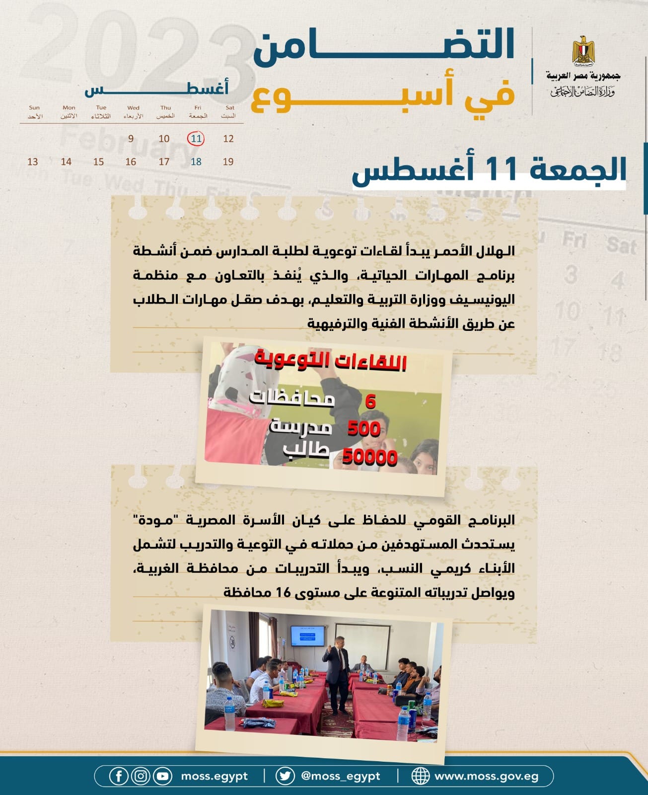 - البرنامج القومى للحفاظ على كيان الاسرة المصرية "مودة" يستحدث المستهدفين من حملاته في التوعية والتدريب لتشمل الأبناء كريمي النسب، ويبدأ التدريبات من محافظة الغربية، ويواصل تدريباته المتنوعة على مستوى 16 محافظة.