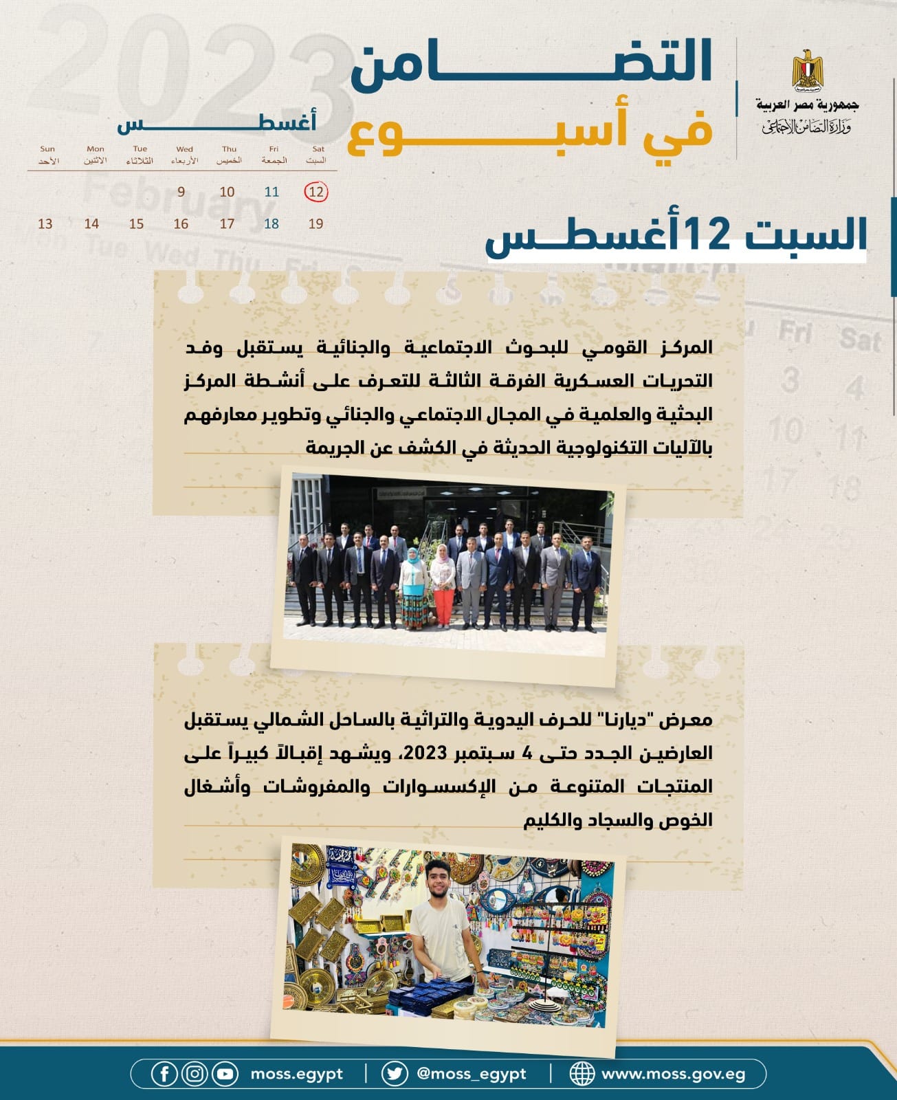 - حملة وزارة التضامن الاجتماعى للتوعية بقضايا التنمية والاسرة "علشان ولادكم... احسبوها صح" تنظم لقاءات جماهيرية موسعة بمحافظة الفيوم تهدف إلى التوعوية بقضيتي عمالة الأطفال والزيادة السكانية، وإقبال كبير من أهالي القرى المستهدفة.