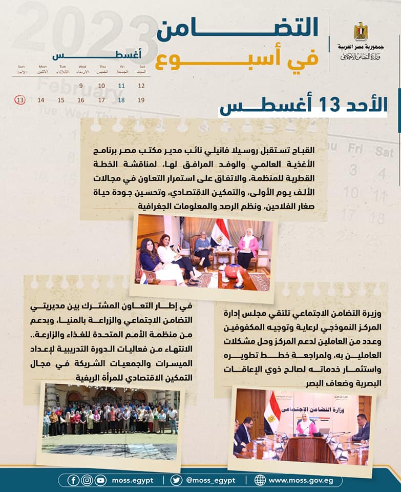 - القباج تستقبل روسيلا فانيلى نائب مدير مكتب مصر برنامج الأغذية العالمى والوفد المرافق لها، لمناقشة الخطة القطرية للمنظمة، والاتفاق على استمرار التعاون في مجالات الألف يوم الأولى، والتمكين الاقتصادي، وتحسين جودة حياة صغار الفلاحين، ونظم الرصد والمعلومات الجغرافية.