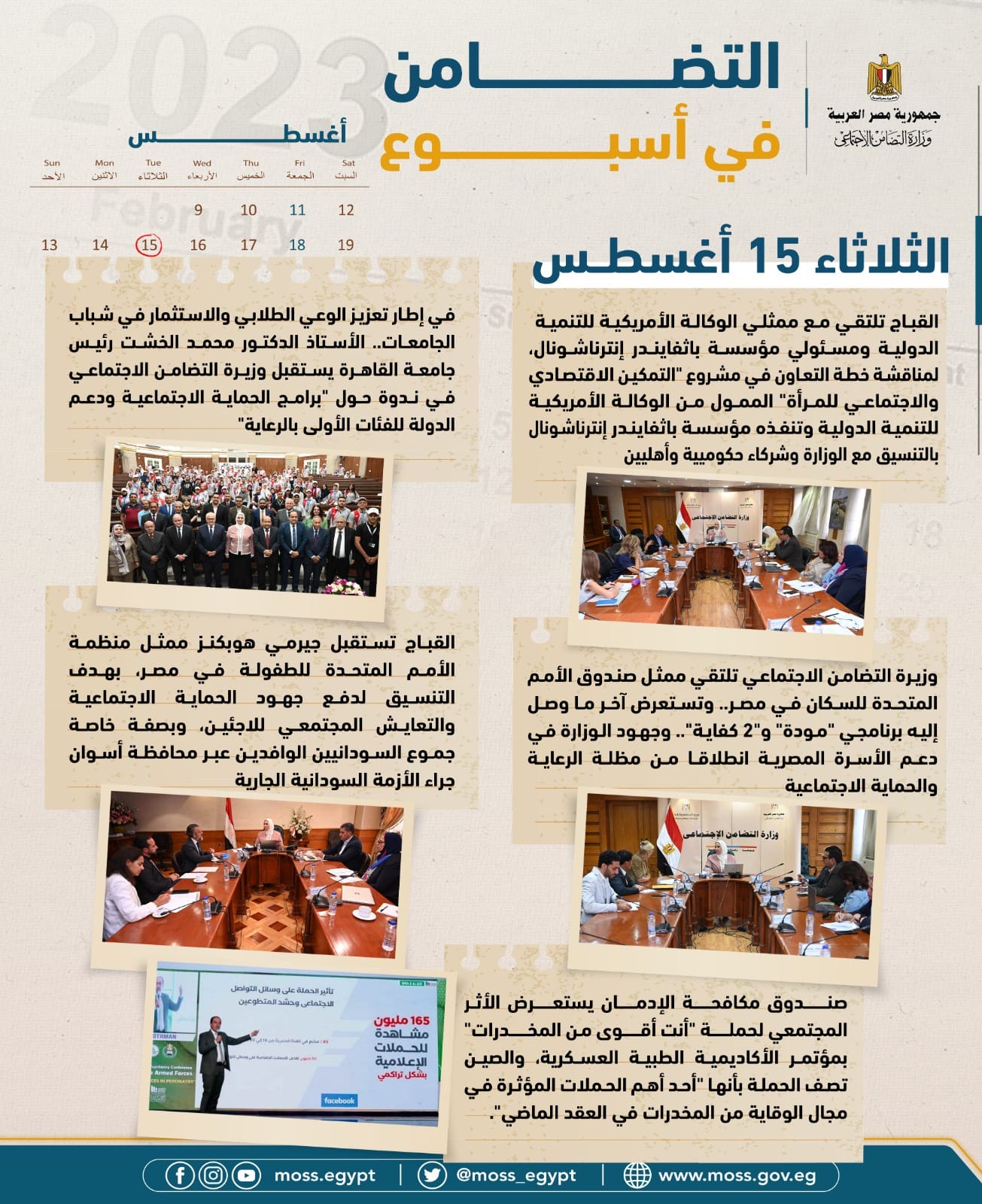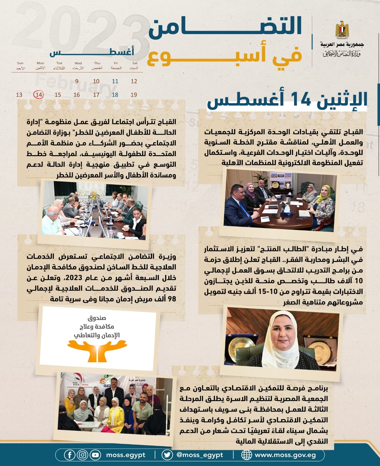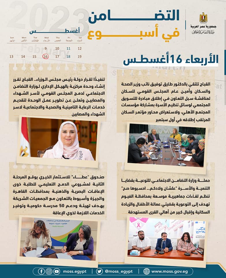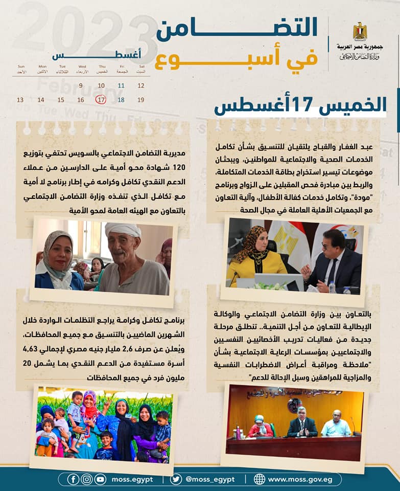 - برنامج تكافل وكرامة يراجع التظلمات الواردة خلال الشهرين الماضيين بالتنسيق مع جميع المحافظات، ويُعلن عن صرف 2,6 مليار جنيه مصري لإجمالي 4,63 أسرة مستفيدة من الدعم النقدي بما يشمل 20 مليون فرد في جميع المحافظات.
